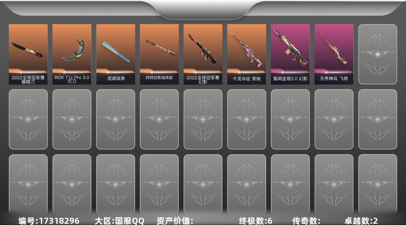 [17318296]【套装】:2022全球冠军赛套装 【英雄】:炼狱,暮蝶,壹决,捷风,幽影,不死鸟,贤者,猎枭,芮娜,奇乐,尚勃勒,霓虹,夜露,K/O,盖可,黑梦,钢锁 【近战武器】:近战武器-2022全球冠军赛 蝴蝶刀,近战武器-RGX 11z Pro//3.0 爪刀,近战武器-澄湖潋滟,近战武器-阿特拉斯指挥部 甩棍 【幻影】:幻影-2022全球冠军赛,幻影-紫阙金琅//2.0 【冥驹】:冥驹-千灵华绽 【飞将】:飞将-天界神兵 【卡面】:Clutch 卡面,无畏契约GO!第一卷:芮娜 卡面,无畏契约GO!第一卷:零 卡面,《双城之战》金克丝 卡面,别冒尖 卡面,铁臂设计图 卡面,代号红色 卡面,新兵报到 卡面,V契约 卡面,无畏契约 卡面 【喷漆】:买装还是存钱 喷漆,放下武器 喷漆,胜利属于无畏契约 喷漆,GLHF 喷漆,无畏契约 喷漆 【挂饰】:天外飞客 挂饰,好运福爪 挂饰,《双城之战》魄罗 挂饰,海豹的认可 挂饰,无畏契约 纪念币 挂饰