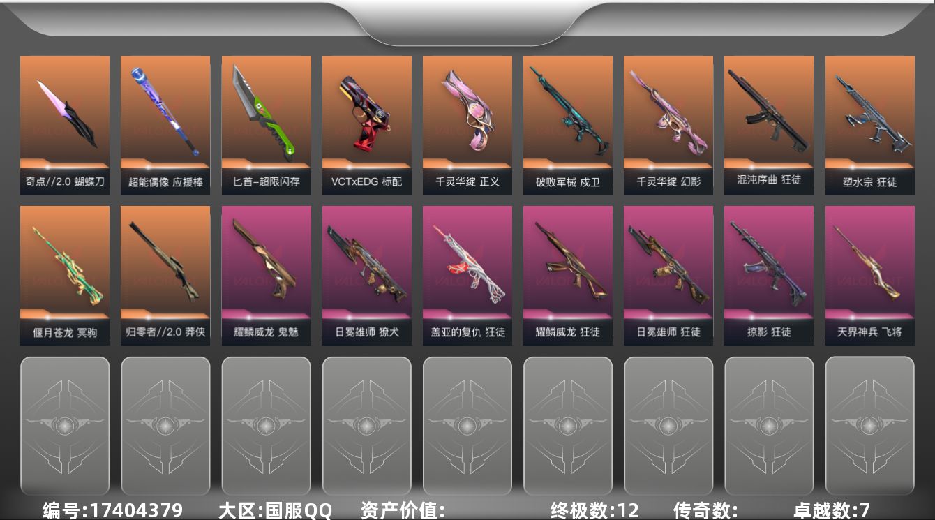 [17404379]【套装】:VCTxEDG 队伍套装 【英雄】:幻棱,炼狱,维斯,暮蝶,钛狐,壹决,铁臂,捷风,雷兹,幽影,不死鸟,贤者,猎枭,蝰蛇,零,芮娜,奇乐,尚勃勒,霓虹,斯凯,夜露,星礈,K/O,海神,盖可,黑梦,钢锁 【近战武器】:近战武器-剥皮小刀,近战武器-奇点//2.0 蝴蝶刀,近战武器-超能偶像 应援棒,近战武器-超限闪存 匕首 【狂徒】:狂徒-混沌序曲,狂徒-塑水宗,狂徒-掠影,狂徒-盖亚的复仇,狂徒-日冕雄师,狂徒-耀鳞威龙,狂徒-超能偶像,狂徒-流星兵团 【幻影】:幻影-千灵华绽,幻影-超限闪存,幻影-神圣领域,幻影-聚合之力 【戍卫】:戍卫-破败军械,戍卫-超能偶像,戍卫-浮光跃金,戍卫-战术熊与伙伴们,戍卫-月球哨兵 【獠犬】:獠犬-日冕雄师,獠犬-神圣领域,獠犬-采蜜小蜂队,獠犬-模拟赫兹 【冥驹】:冥驹-偃月苍龙,冥驹-模拟赫兹,冥驹-星云暗涌 【飞将】:飞将-天界神兵,飞将-聚合之力,飞将-战术熊与伙伴们 【莽侠】:莽侠-归零者//2.0,莽侠-超限闪存,莽侠-纤云弄巧,莽侠-月球哨兵 【战神】:战神-神圣领域,战神-采蜜小蜂队,战神-浮光跃金 【奥丁】:奥丁-流星兵团 【判官】:判官-超能偶像,判官-采蜜小蜂队 【雄鹿】:雄鹿-模拟赫兹,雄鹿-月球哨兵 【骇灵】:骇灵-流星兵团,骇灵-浮光跃金,骇灵-星云暗涌 【蜂刺】:蜂刺-超限闪存,蜂刺-聚合之力,蜂刺-纤云弄巧,蜂刺-星云暗涌 【标配】:标配-超能偶像,标配-浮光跃金,标配-战术熊与伙伴们 【VCT手枪】:标配-VCT x EDG 【正义】:正义-千灵华绽,正义-超限闪存,正义-纳米打击,正义-纤云弄巧,正义-月球哨兵 【鬼魅】:鬼魅-耀鳞威龙,鬼魅-采蜜小蜂队,鬼魅-灵魂消声者,鬼魅-模拟赫兹 【狂怒】:狂怒-神圣领域,狂怒-聚合之力,狂怒-战术熊与伙伴们 【短炮】:短炮-纤云弄巧 【卡面】:终章:激斗汉堡 卡面,进入射程 卡面,《双城之战》拥抱 卡面,精灵大战 卡面,欢迎来到底城 卡面,南瓜盛典 卡面,VCT CN首冠 卡面,唱片的故事 卡面,钢弓与箭弦 卡面,排除故障 卡面,战术桌游 卡面,悠享食光 卡面,修车达人 卡面,热舞环节 卡面,模拟赫兹 卡面,浮光跃金 卡面,超限闪存 卡面,维斯工牌 卡面,正义的化身 卡面,终章:生意人麦宝 卡面,铁之华 卡面,失而复得 卡面,时间到 卡面
