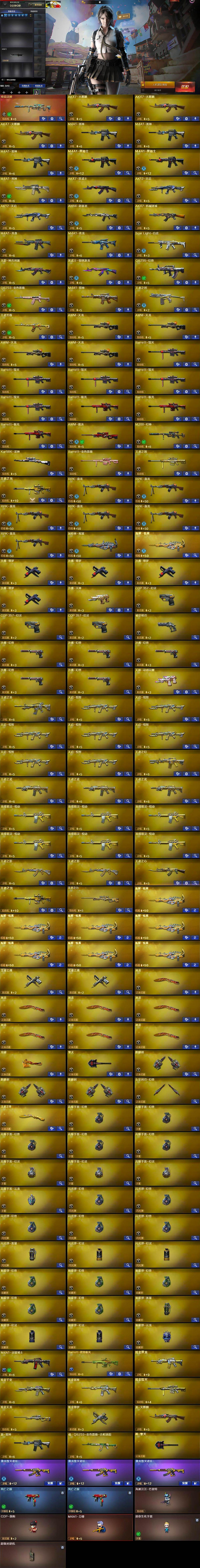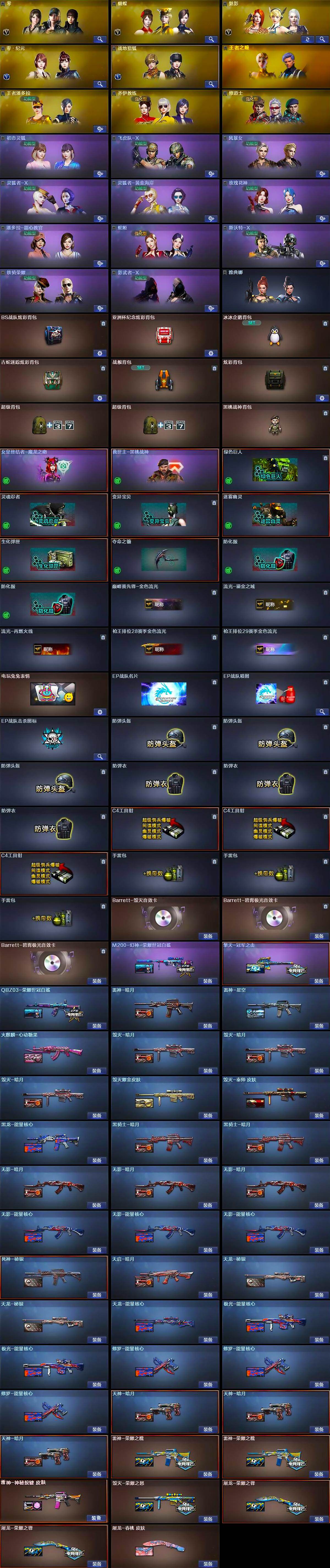 【英雄级武器】:AK47-火麒麟*3,M4A1-雷神*3,M4A1-黑骑士*2,M4A1-死神,AK47-黑武士,AK12-天启*2,AN94-超新星,AK47-机械迷城,M4A1-龙血,M4A1-青龙,Scar Light-白虎,无影-神兵利器,黑武士-锦绣游龙,QBZ95-幻兽,QBZ03-金色蔷薇,M4A1-猎神,王者之烈-觉醒版,王者芳薇-觉醒版,AWM-天龙*4,Barrett-毁灭*5,Barrett-极光*3,AWM-裁决,M200-幻神,Kar98K-星神,Barrett-金色蔷