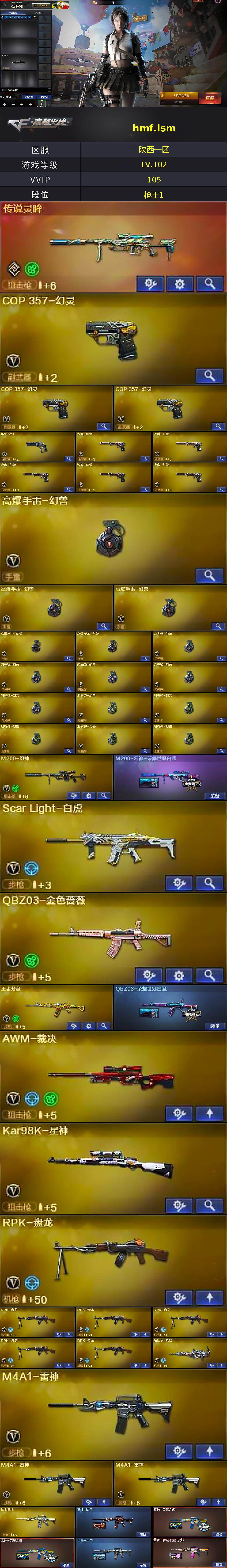 【热门武器】:传说灵眸,QBZ03-金色蔷薇,Scar Light-白虎,M4A1-青龙,M200-幻神,死亡之眼*2,Kar98K-星神,金色小号,M4A1-黑骑士*2,RPK-盘龙*6,加特林-炼狱,COP 357-幻灵*3,沙鹰-修罗*4,黄金猫猫手套-白鲨,高爆手雷-幻兽*5