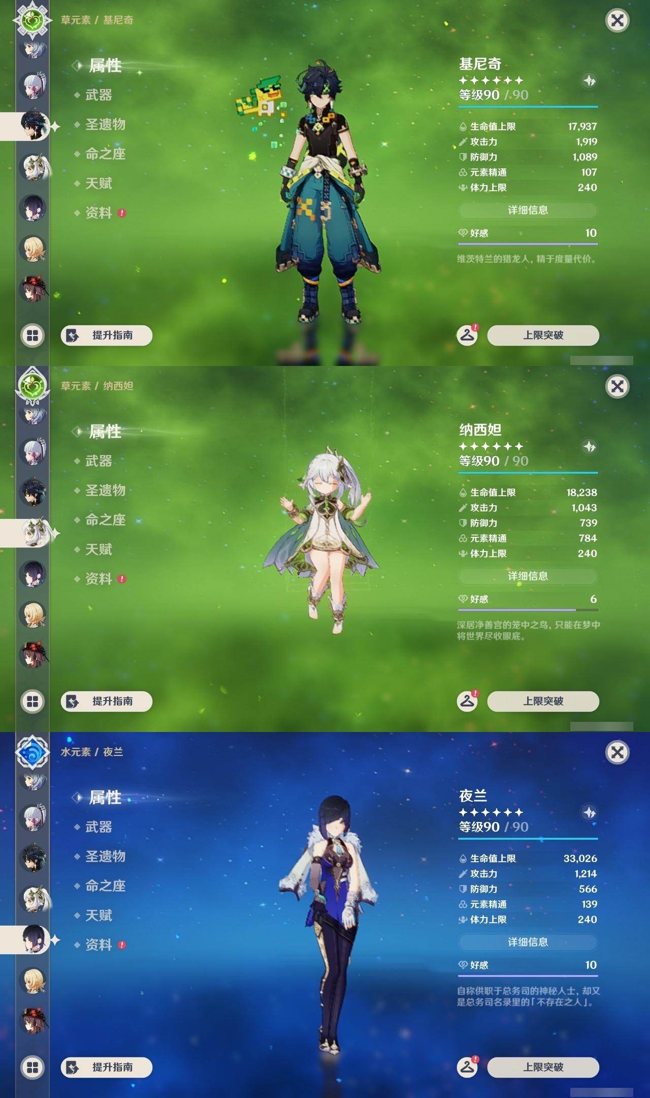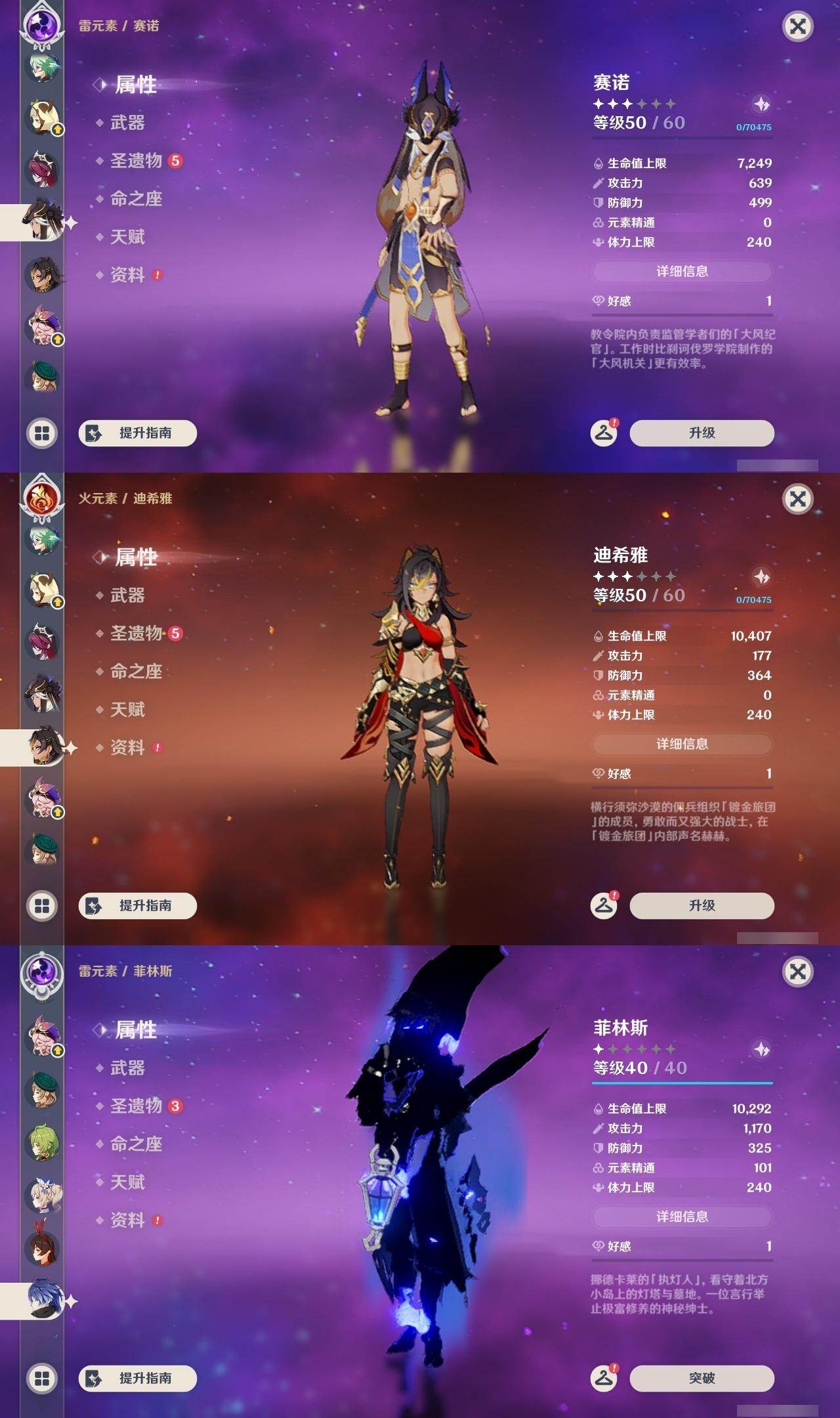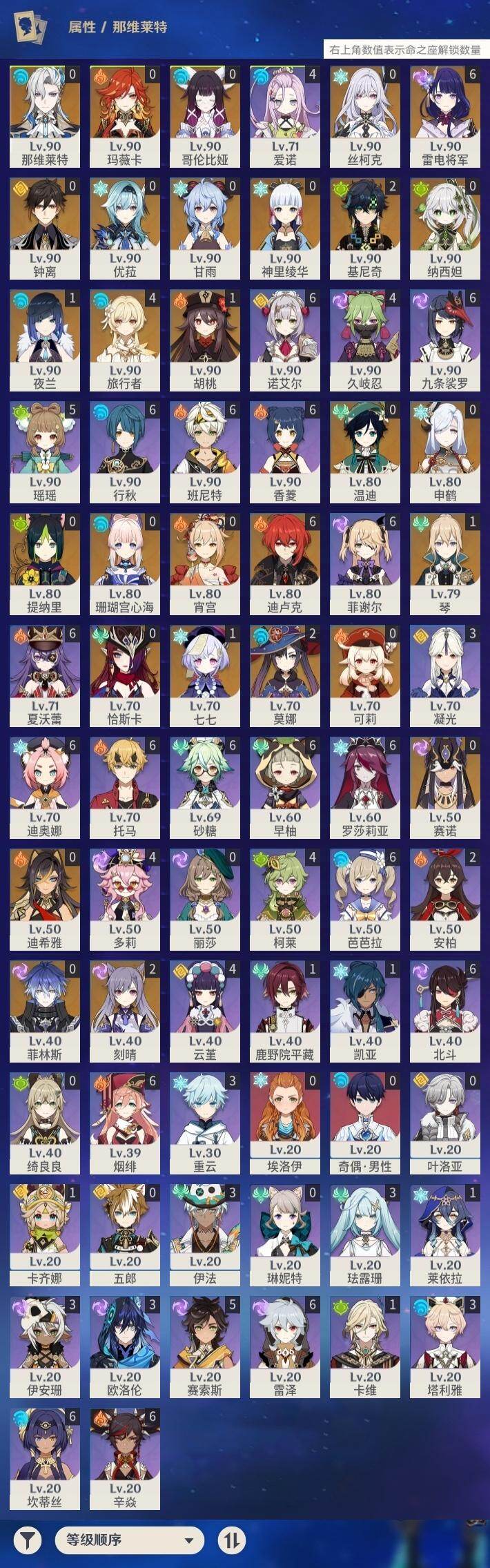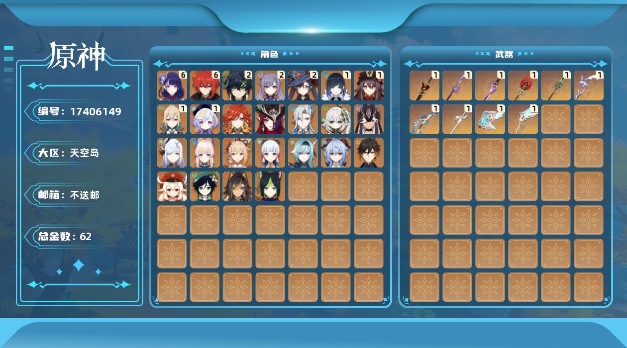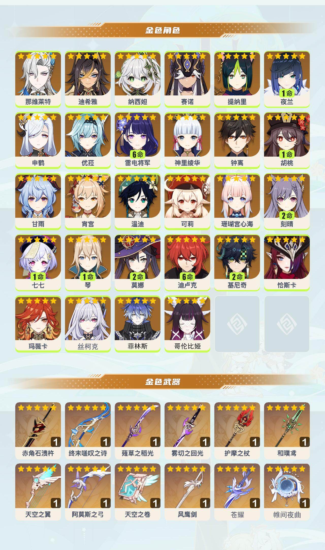 0命那维莱特,0命迪希雅,0命纳西妲,0命赛诺,0命提纳里,1命夜兰,0命申鹤,0命优菈,满命雷电将军,0命神里绫华,0命钟离,1命胡桃,0命甘雨,0命宵宫,0命温迪,0命可莉,0命珊瑚宫心海,2命刻晴,1命七七,1命琴,2命莫娜,满命迪卢克,2命基尼奇,0命恰斯卡,0命玛薇卡,0命丝柯克,0命菲林斯,0命哥伦比娅,精1赤角石溃杵,精1终末嗟叹之诗,精1薙草之稻光,精1雾切之回光,精1护摩之杖,精1和璞鸢,精1天空之翼,精1阿莫斯之弓,精1天空之卷,精1风鹰剑,精1苍耀,精1帷间夜曲