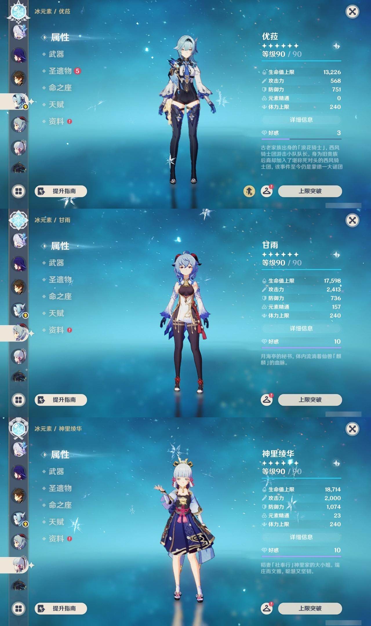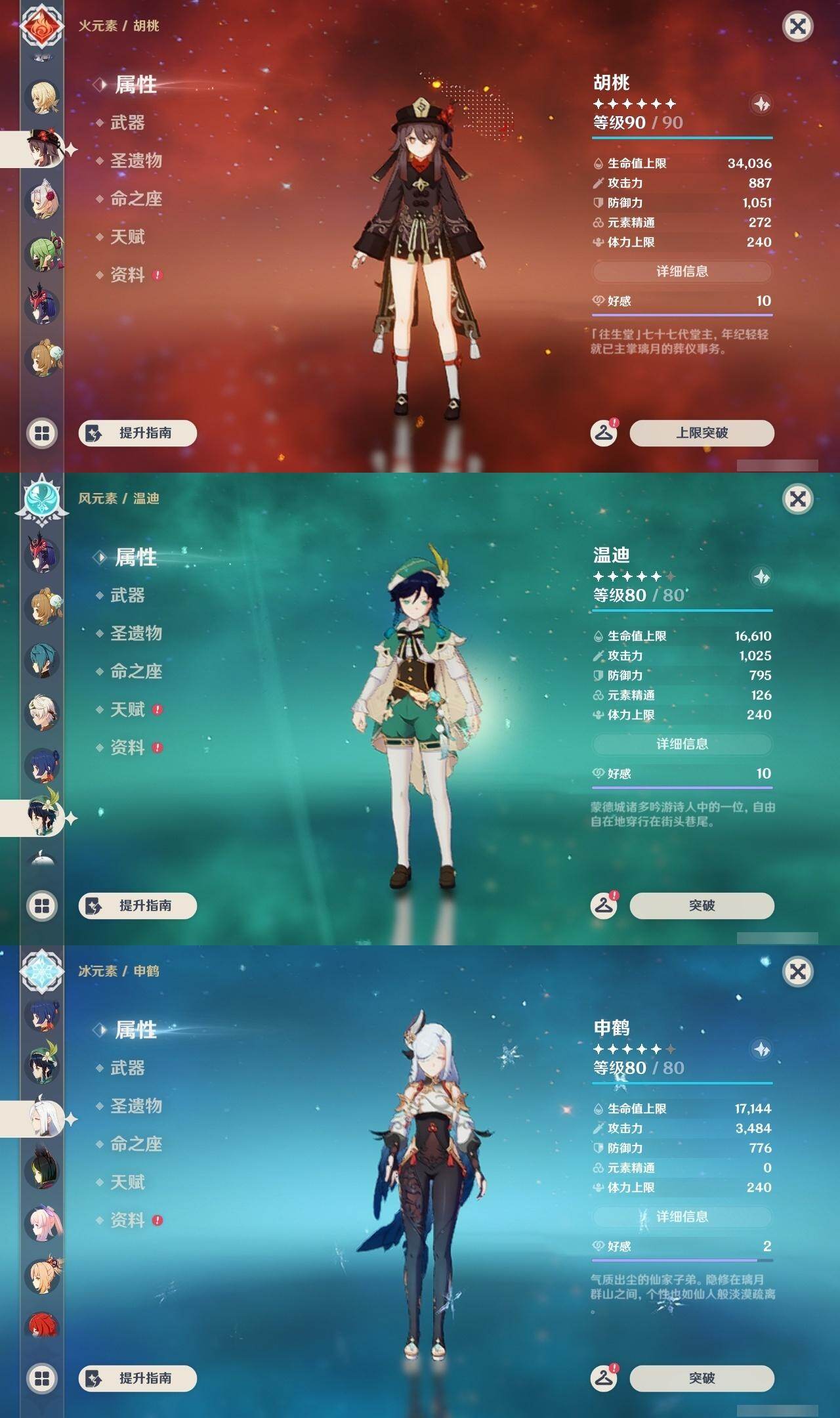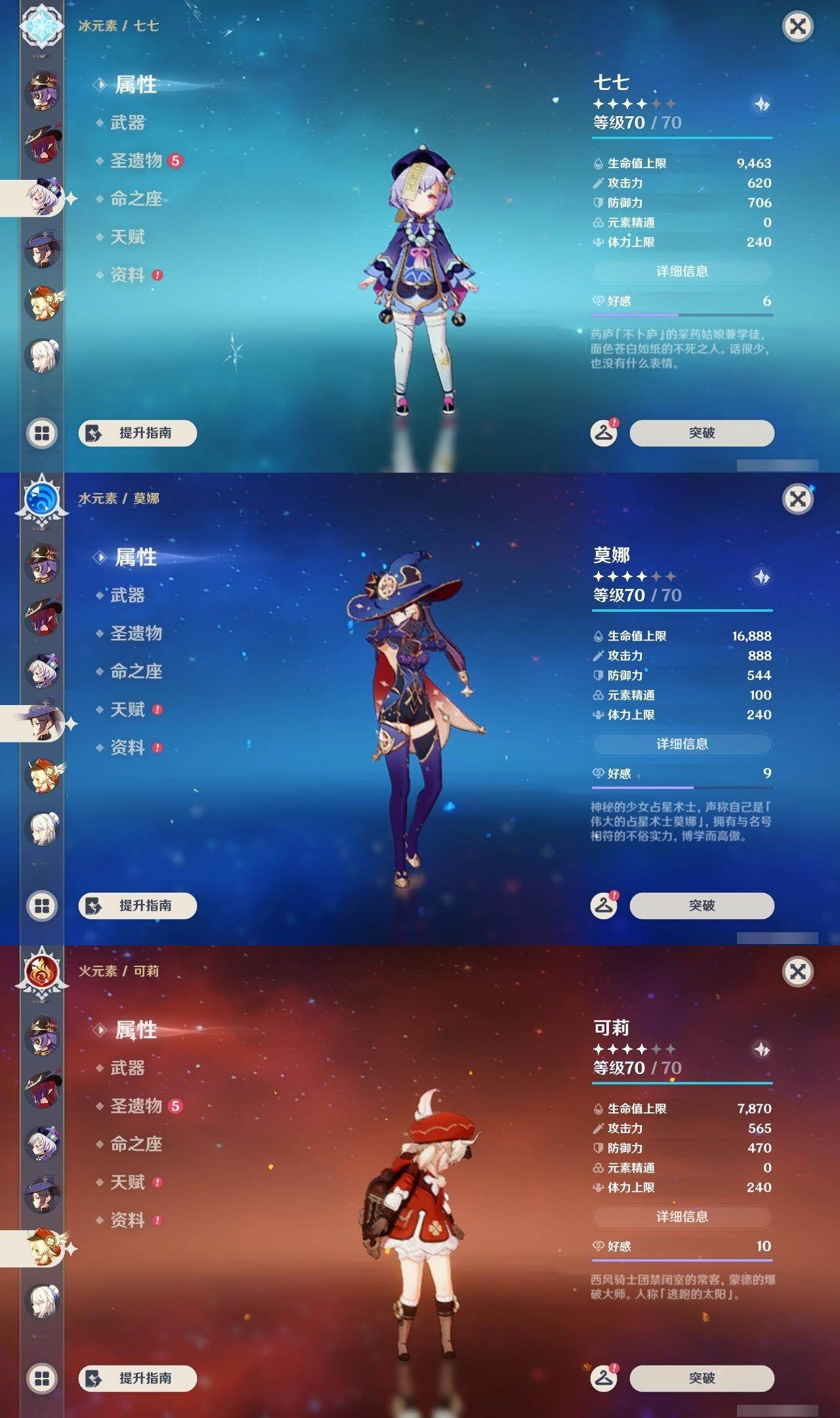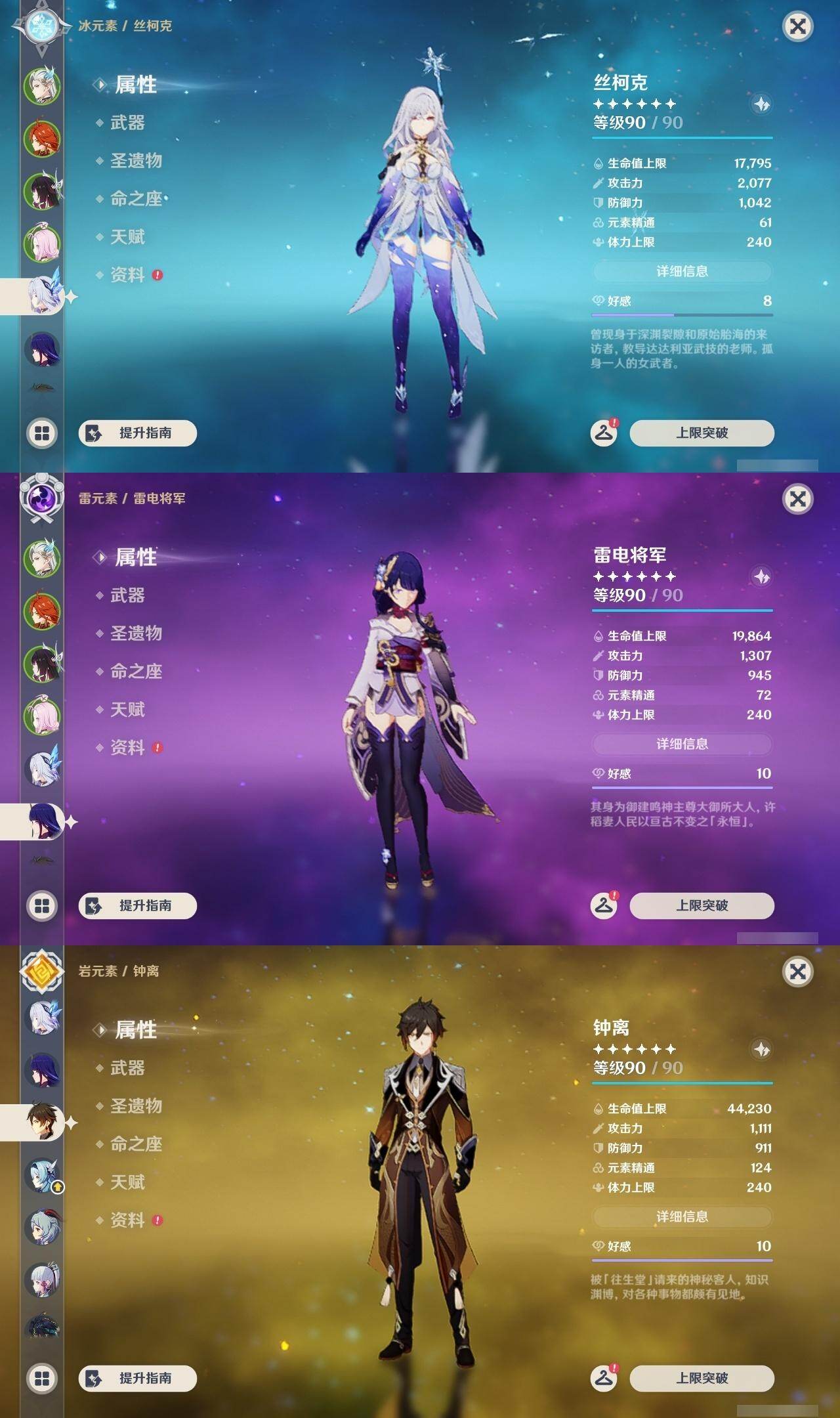 雷电将军,钟离,优菈,甘雨,神里凌华,胡桃,温迪,申鹤,珊瑚宫心海,宵宫,迪卢克,琴,七七,莫娜,可莉,刻晴