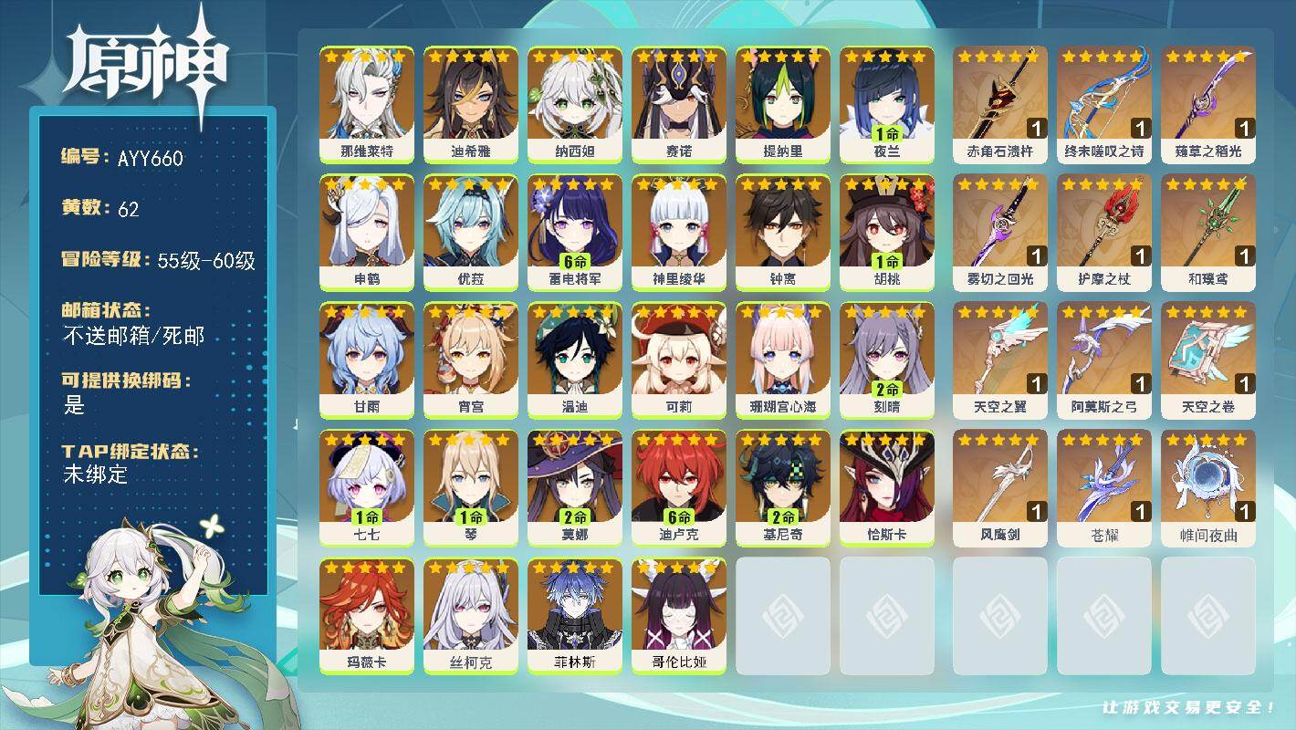 [17406149]60级/62黄/女主/28个五星角色/12个五星武器 0命那维莱特,0命迪希雅,0命纳西妲,0命赛诺,0命提纳里,1命夜兰,0命申鹤,0命优菈,满命雷电将军,0命神里绫华,0命钟离,1命胡桃,0命甘雨,0命宵宫,0命温迪,0命可莉,0命珊瑚宫心海,2命刻晴,1命七七,1命琴,2命莫娜,满命迪卢克,2命基尼奇,0命恰斯卡,0命玛薇卡,0命丝柯克,0命菲林斯,0命哥伦比娅,精1赤角石溃杵,精1终末嗟叹之诗,精1薙草之稻光,精1雾切之回光,精1护摩之杖,精1和璞鸢,精1天空之翼,精1阿莫斯之弓,精1天空之卷,精1风鹰剑,精1苍耀,精1帷间夜曲