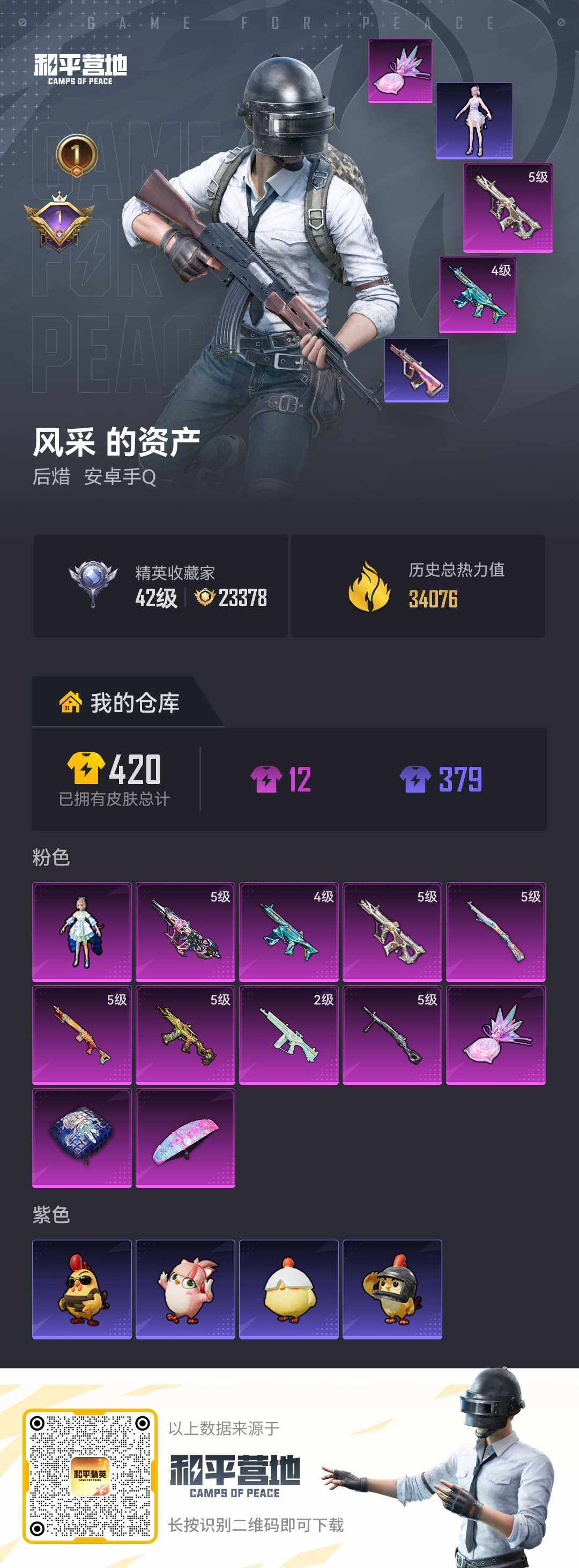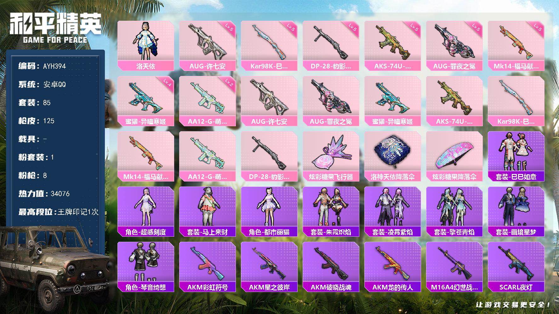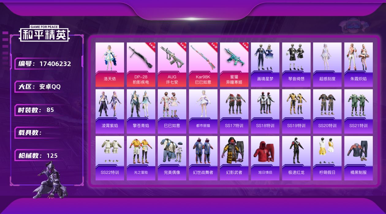 安卓 手Q-1粉装-8特效枪-0载具-1粉色飞行器-34076热力值-1王牌印记-85套装-125枪皮【粉色套装】:角色-洛天依【粉色枪皮等级】:AUG-许七安(五级),AUG-罪夜之冕(五级),蜜獾-异瞳寒姬(四级),AKS-74U-森灵之息(五级),Kar98K-巳巳如意(五级),Mk14-福马献瑞(五级),AA12-G-萌骑幻想(二级),DP-28-豹影疾电(五级)【粉色枪皮】:AUG-许七安,AUG-罪夜之冕,蜜獾-异瞳寒姬,AKS-74U-森灵之息,Kar98K-巳巳如意,Mk14-福马献瑞,AA12-G-萌骑幻想,DP-28-豹影疾电【粉色飞行器】:炫彩糖果飞行器