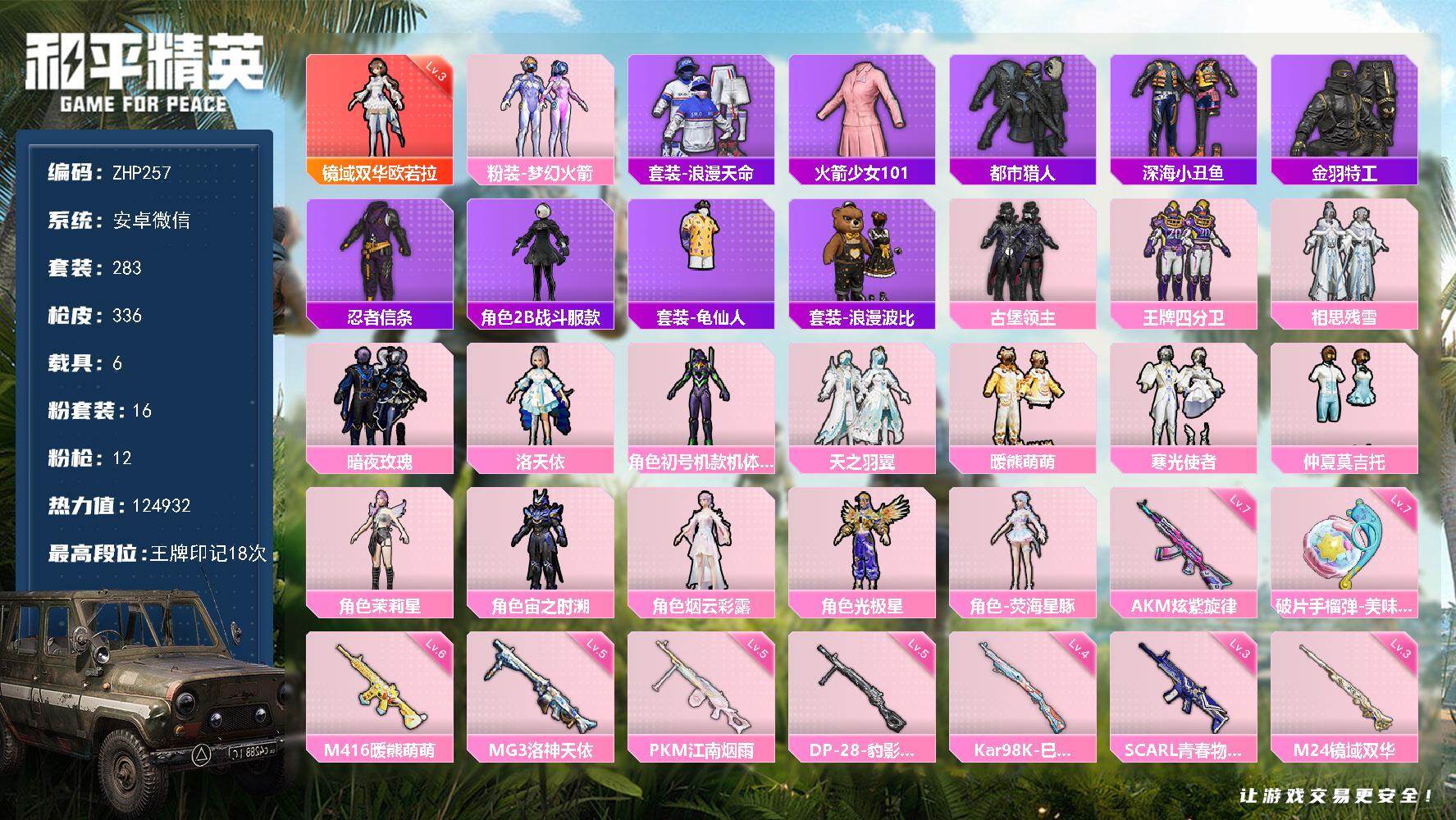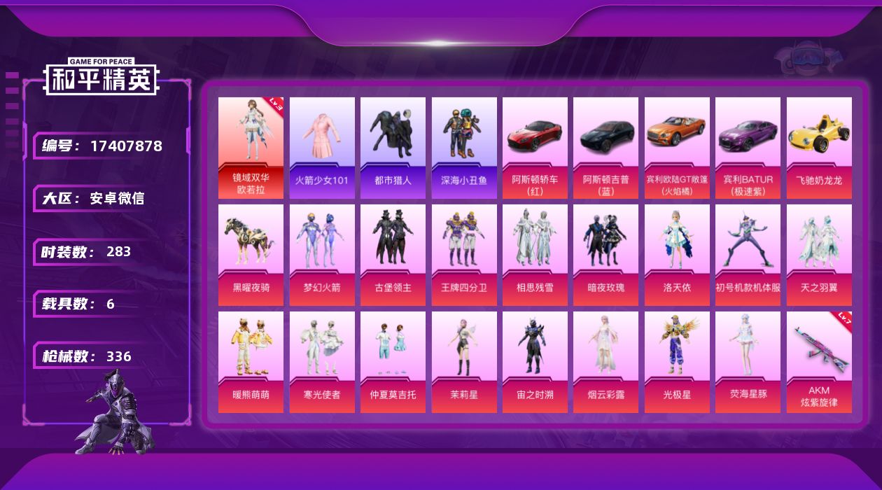 [17407878]3级欧若拉/螳螂/老101/都市/安卓 微信-1神装-16粉装-12特效枪-6载具-10粉色飞行器-124932热力值-18王牌印记-283套装-336枪皮