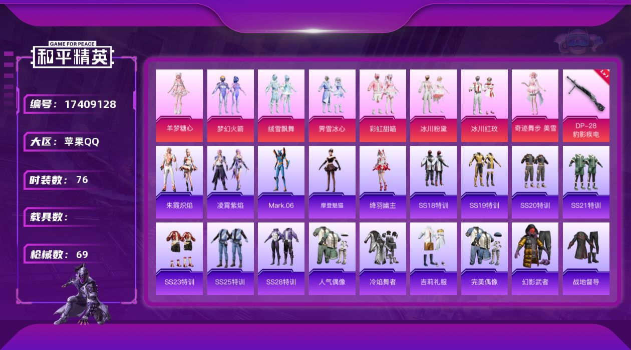 [17409128]【特价出售/店主推荐】 苹果 手Q-8粉装-1特效枪-0载具-3粉色飞行器-25608热力值-3王牌印记-76套装-69枪皮 【热门品类】:粉装-梦幻火箭,角色-Mark.06 【粉色套装】:粉装-梦幻火箭,粉装-绒雪飘舞,粉装-霁雪冰心,粉装-彩虹甜喵,粉装-冰川粉黛,粉装-冰川红玫,角色-奇迹舞步 美雪,角色-羊梦糖心 【粉色枪皮等级】:DP-28-豹影疾电(一级) 【粉色枪皮】:DP-28-豹影疾电 【粉色飞行器】:梦幻火箭飞行器,庄周梦蝶飞行器,太空嘟嘟飞行器 【粉色降落伞】:梦幻火箭降落伞,庄周梦蝶降落伞,绒雪飘舞降落伞,太空嘟嘟降落伞,彩虹甜喵降落伞,冰川粉黛降落伞,精灵梦叶罗丽降落伞,金丰海韵降落伞,千金淑猫降落伞,绯穹魔姬降落伞 【稀有套装】:角色-摩登魅猫,角色-绛羽幽主,套装-朱霞炽焰,套装-凌霄紫焰 【稀有枪皮】:AKM-2P战斗服款,AKM-环太平洋,M16A4-幻世战舞者,SCAR-L-玉兔迎春,SCAR-L-甜蜜誓约,SCAR-L-银碳小老虎,SCAR-L-黄金龙骨,M416-蓝色火焰,GROZA-2B战斗服款,GROZA-恐龙拽拽,AUG-2P战斗服款,AUG-冰川粉黛,AUG-耀粉歌者,QBZ-飞驰魅影,M762-绒雪飘舞,蜜獾-娇憨猪猪,蜜獾-绯穹魔姬,ARX-凌霄紫焰,UZI-天降萌叽,UZI-娇憨猪猪,UMP45-时空追击者,UMP45-炫光之旅,UMP45-猪猪侠,汤姆逊-庄周梦蝶,JS9-凌霄紫焰,P90-飞驰魅影,Kar98K-飞驰魅影,M24-拂晓神骑,SKS-炫彩节奏,Mini14-旋转彩虹,Mini14-炫彩节奏,Mini14-绯穹魔姬,SLR-娇憨猪猪,SLR-月影鸳鸯,莫辛纳甘-银碳小老虎,S686-千金淑猫,S1897-炫彩节奏,S1897-飞驰魅影,S12K-破晓战魂,S12K-冰川粉黛,S12K-娇憨猪猪,DBS-彩虹甜喵,DP-28-彩虹符号,MG-36-凌霄紫焰,P92-凌霄紫焰,爆炸猎弓-喜羊羊与灰太狼,平底锅-凌霄紫焰 【其他套装】:套装-SS18特训,套装-SS19特训,套装-SS20特训,套装-SS21特训,套装-SS23特训,套装-SS25特训,套装-SS28特训,套装-人气偶像,套装-冷焰舞者,套装-吉莉礼服,套装-完美偶像,套装-幻影武者,套装-战地督导,套装-柠萌假日,套装-深蓝色名流