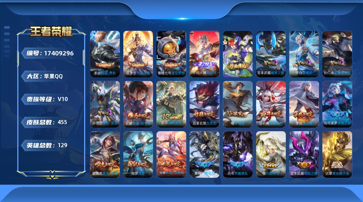[17409296]可二次【特价出售/店主推荐/1省标/3市标/7090星币】:苹果Q-V10-最强王者段位-129英雄-455皮肤-3典藏皮肤-1典藏英雄-1无双-1珍品传说-4星元-51传说-152史诗