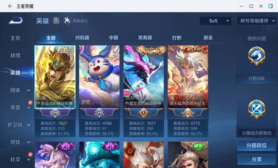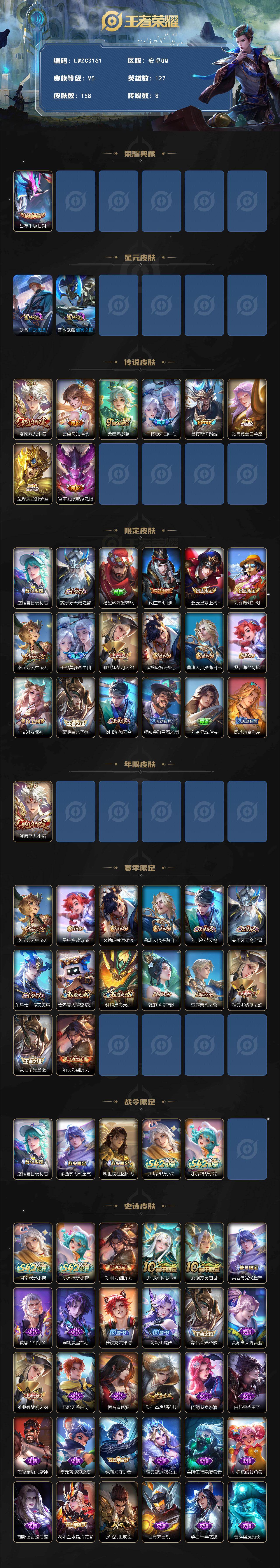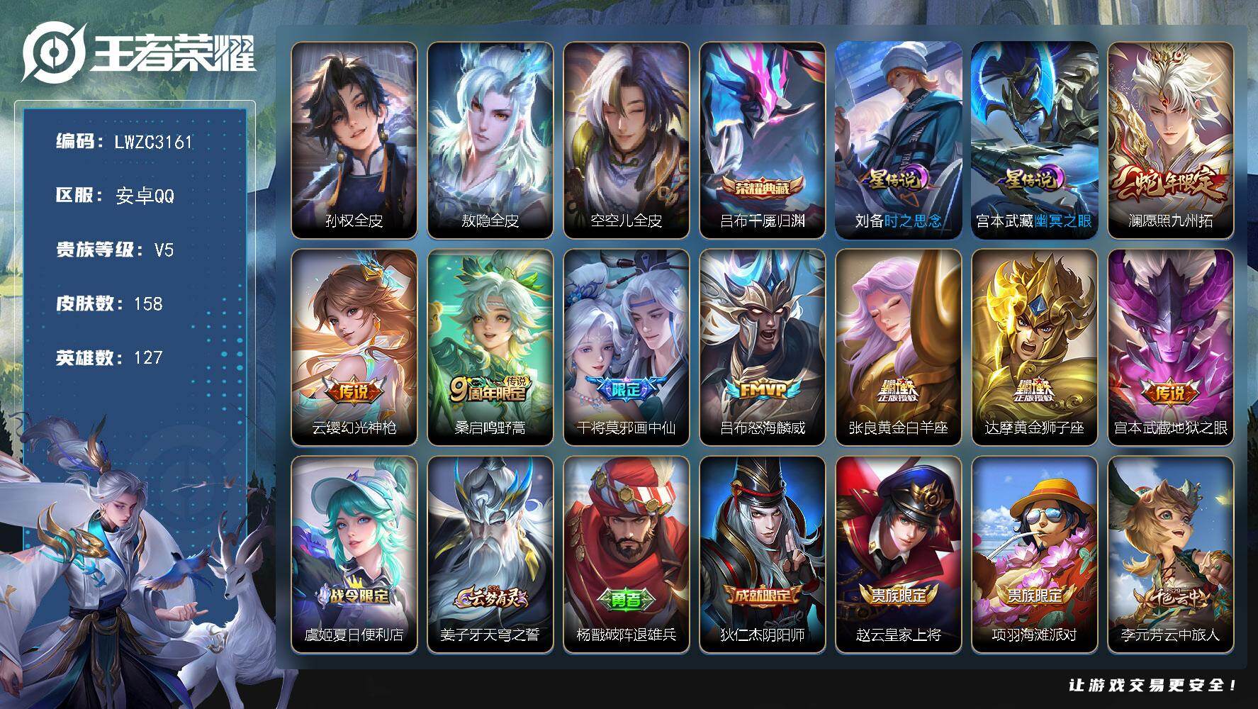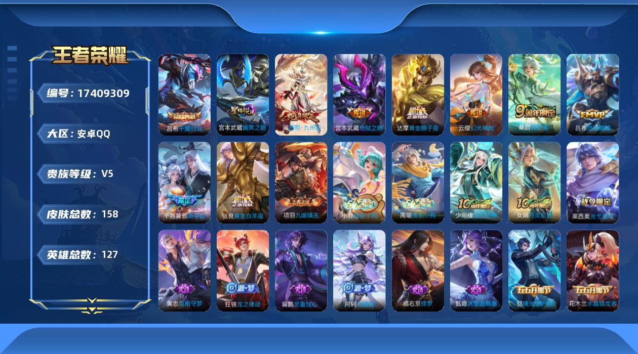 [17409309]【特价出售/店主推荐/2市标/30段打野】:安卓Q-V5-最强王者段位-127英雄-158皮肤-1典藏皮肤-2星元-8传说-39史诗