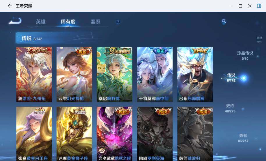 【传说皮肤】:澜愿照九州拓,云缨幻光神枪,桑启鸣野蒿,干将莫邪画中仙,吕布怒海麟威,张良黄金白羊座,达摩黄金狮子座,宫本武藏地狱之眼