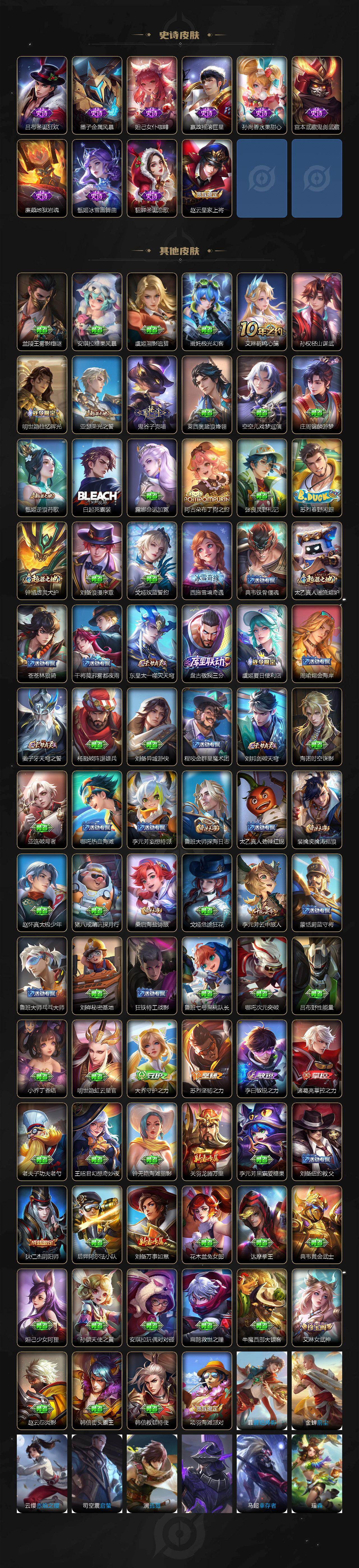 【史诗皮肤】:周瑜线条小狗,小乔线条小狗,项羽九幽镇关,少司缘巫礼祀神,女娲万灵启世,莱西奥光弋星穹,黄忠百相守梦,扁鹊灵蛊蚀心,狂铁龙之律动,阿轲化蝶舞,蒙恬荣光圣徽,高渐离天秀音浪,雅典娜黎明之约,杨戬天秀启明,橘右京修罗,狄仁杰鹰眼统帅,阿轲节奏热浪,白起星夜王子,程咬金功夫厨神,李元芳逐浪之夏,铠曙光守护者,雅典娜冰冠公主,兰陵王暗隐猎兽者,小乔缤纷独角兽,刘邦德古拉伯爵,花木兰水晶猎龙者,张飞乱世虎臣,吕布末日机甲,李白千年之狐,曹操幽灵船长,吕布圣诞狂欢,墨子金属风暴,妲己女仆咖啡,嬴政摇滚巨星,孙尚香水果甜心,宫本武藏鬼剑武藏,廉颇地狱岩魂,甄姬冰雪圆舞曲,貂蝉圣诞恋歌,赵云皇家上将