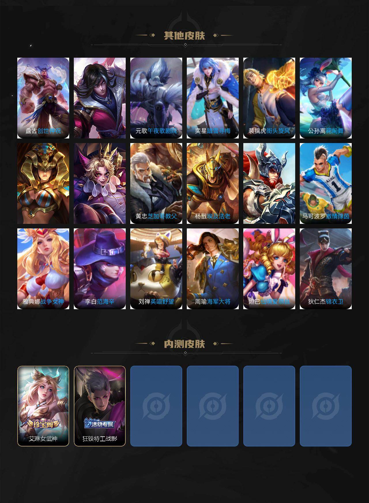 【其他皮肤】:兰陵王雾影缉谜,安琪拉糖果风暴,虞姬溯影追猎,蚩奼极光幻客,艾琳鹤鸣心笺,孙权径山谋武,明世隐往忆晖光,亚瑟荣光之誓,鬼谷子克喵,莱西奥踏浪烽翎,空空儿戏梦巡演,庄周锦麟游梦,甄姬逆浪荇歌,白起死霸装,露娜命运加冕,阿古朵布丁狗之约,张良灵野札记,苏烈春野闲踪,钟馗虚灵犬护,刘备浪漫序章,戈娅玫蓝誓约,西施雪境奇遇,典韦铁骨偃魂,太乙真人谧流熔炉,苍苍林狼骑,干将莫邪雾都夜雨,东皇太一噬灭天穹,盘古