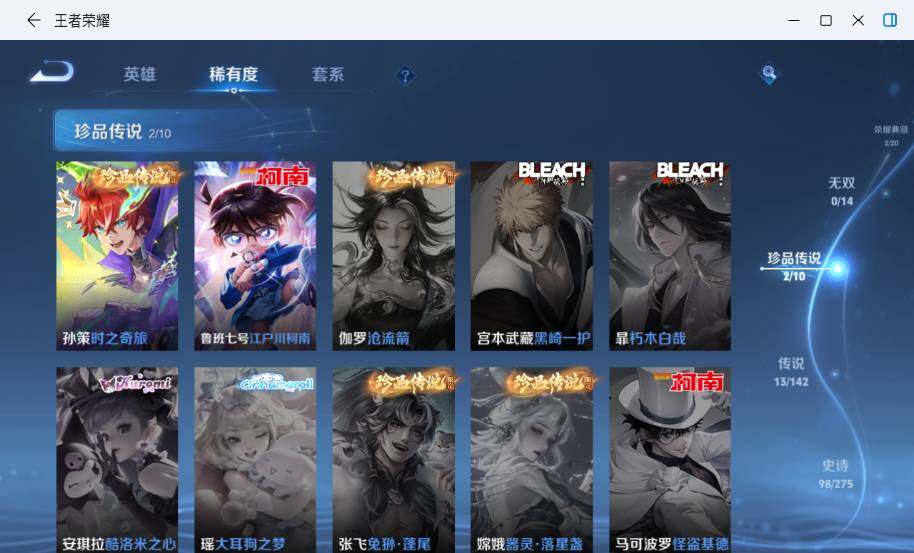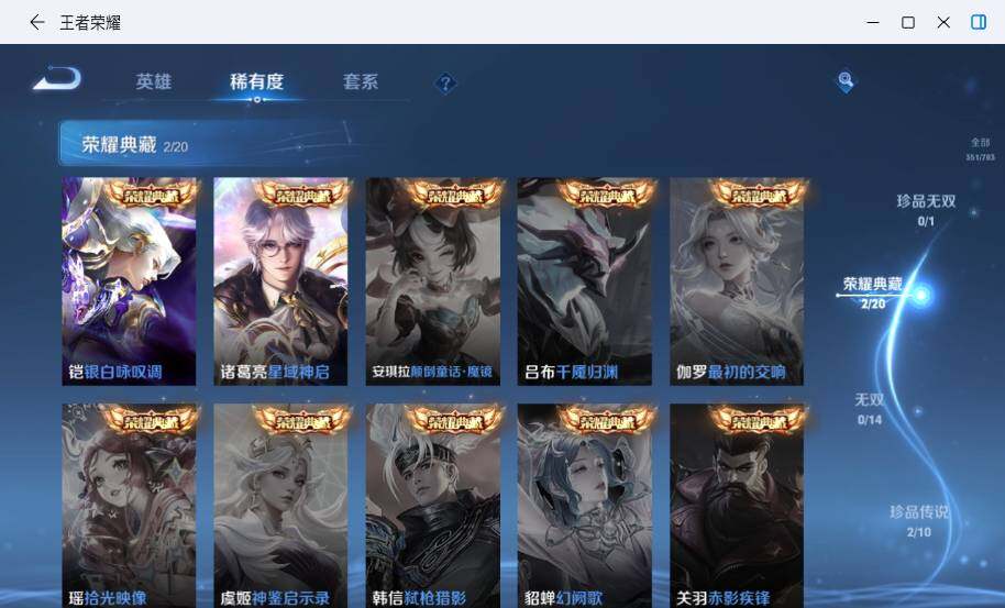- PX_2106408-Q/非凡王者/82皮肤/96英雄/0典藏/0珍品无双/0无双/0珍品传说/6传说/21史诗/5稀有英雄 【6 传说皮肤】无双飞将 马超,地狱火 孙悟空,浮生妄 夏洛特,炽阳神光 镜,末日机甲 孙尚香,一念神魔 李信, 【21 史诗皮肤】紫霞仙子 露娜,匿光决锋者 夏侯惇,摇滚巨星 嬴政,魅力维加斯 妲己,赞萌露比 云缨,偶像歌手 王昭君,赏金猎手 澜,鹰眼统帅 狄仁杰,傲雪梅