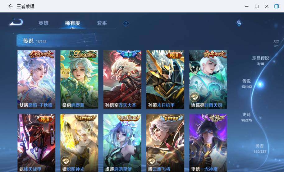 【传说皮肤】:女娲愿照千秋盛,桑启鸣野蒿,孙悟空齐天大圣,孙策末日机甲,诸葛亮时雨天司,铠绛天战甲,镜炽阳神光,虞姬启明星使,曜云鹰飞将,李信一念神魔,干将莫邪久胜战神,宫本武藏地狱之眼,狄仁杰超时空战士