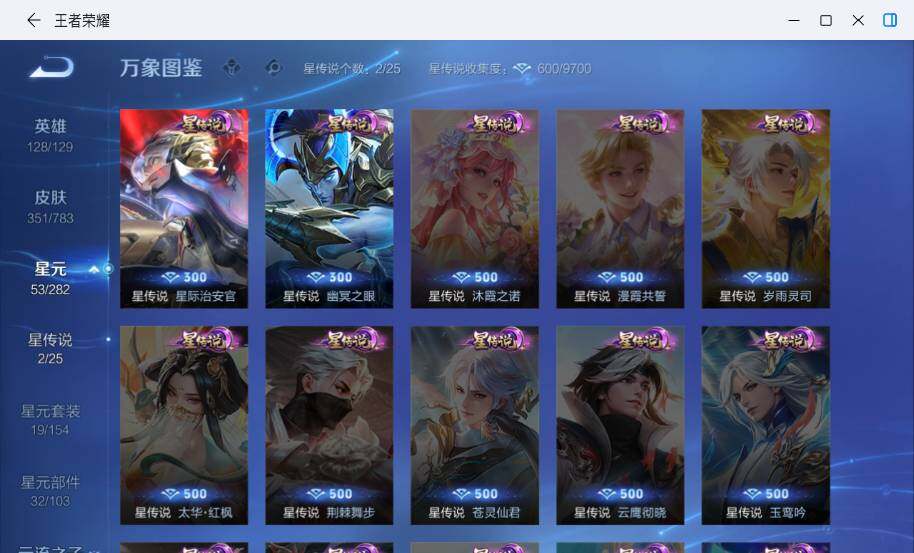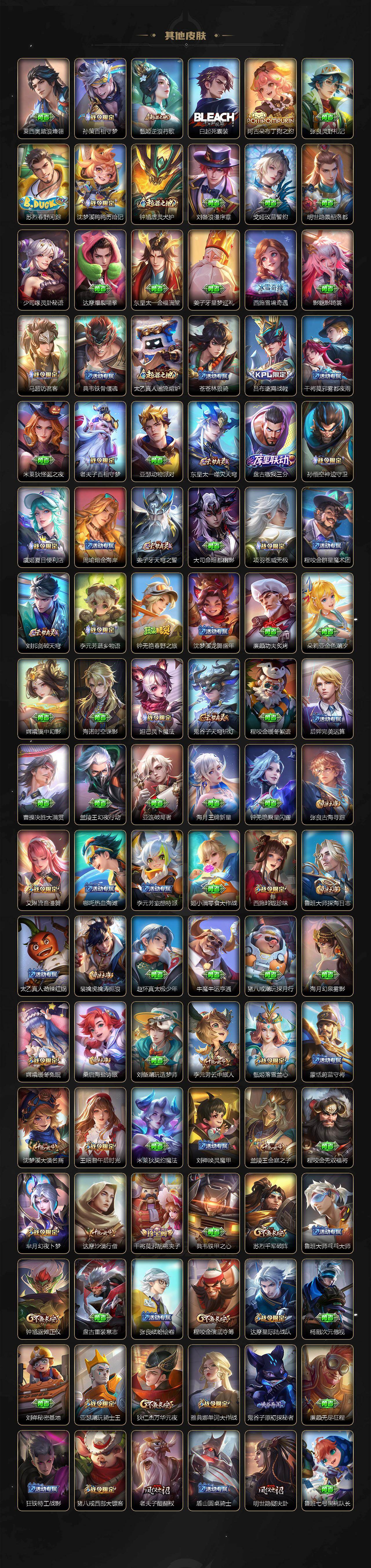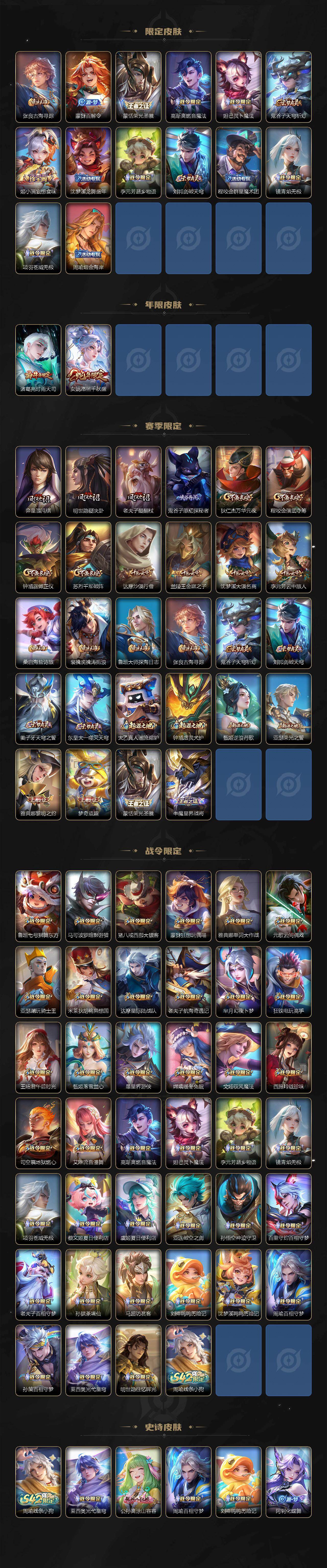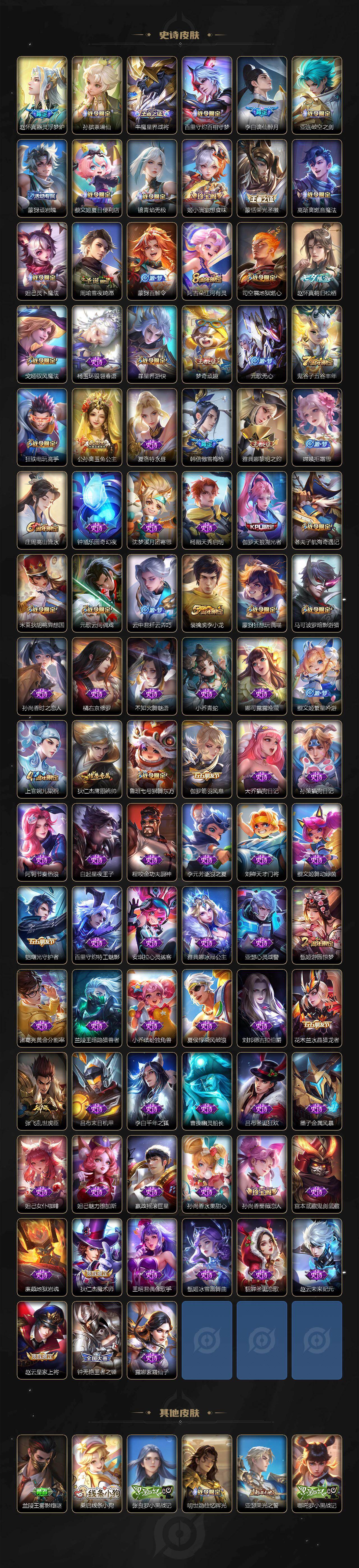【限定皮肤】:蒙犽顽岩魄,蔡文姬夏日便利店,虞姬夏日便利店,姜子牙天穹之誓,李白谪仙醉月,狄仁杰阴阳师,赵云皇家上将,孙尚香蔷薇恋人,鲁班七号狮舞东方,庄周高山流水,钟无艳王者之锤,芈月幻夜卜梦,元歌云间偶戏,元歌无心,甄姬游园惊梦,甄姬落雪兰心,马可波罗暗影游猎,狄仁杰魔术师,狄仁杰万华元夜,达摩星际陆战队,达摩沙漠行僧,项羽海滩派对,老夫子醍醐杖,老夫子航海奇遇记,程咬金演武夺筹,韩信傲雪梅枪,王昭君午后时光,兰陵王金庭之子,亚瑟潮玩骑士王,孙悟空齐天大圣,李元芳云中旅人,虞姬启明星使,钟馗驱傩正仪,干将莫邪胡桃夹子,雅典娜单词大作战,雅典娜黎明之约,蔡文姬繁星吟游,鬼谷子原初探秘者,鬼谷子五谷丰年,诸葛亮时雨天司,苏烈千军破阵,弈星混沌棋,梦奇顽趣,公孙离玉兔公主,沈梦溪大漠名商,明世隐疑决卦,裴擒虎李小龙,裴擒虎擒涛扼浪,狂铁电玩高手,米莱狄胡桃异想国,云中君纤云弄巧,伽罗天狼溯光者,猪八戒西部大镖客,上官婉儿梁祝,嫦娥拒霜思,嫦娥暖冬兔眠,西施玲珑珍味,蒙犽狂想玩偶喵,鲁班大师探海日志,桑启海盐诗旅,暃星界游侠,戈娅驭风魔法,艾琳流音漫舞,赵怀真鹤归松栖,司空震地狱燃心,阿古朵江河有灵,张良古海寻踪,蒙犽百解令,蒙恬荣光圣徽,高渐离燃音魔法,妲己灵卜魔法,鬼谷子天穹祈灯,姬小满妄想食味,沈梦溪龙舞盛年,李元芳蔬乡物语,刘邦剑破天穹,程咬金群星魔术团,镜青焰无极,项羽苍威无极,周瑜熔金海岸
