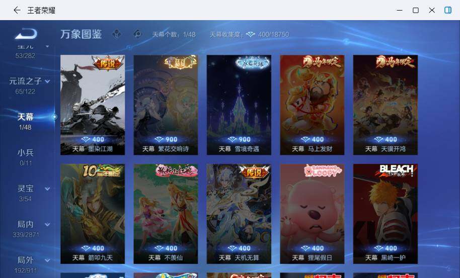 - [12289180]V10 4典藏 4无双 9珍品传说 51传说 126英雄 372皮肤 典藏英雄武则天 可修改实名 优质装备:天鹅之梦(小乔典藏),倪克斯神谕(宇宙婆娘),真我赫兹(瑶)(瑶无双),神鉴启示录,小乔时之魔女(小乔无双),拾光映像(瑶典藏),雪境奇遇-甄姬,天机白泽,江户川柯南,怪盗基德,器灵·落星盏,酷洛米之心,大耳狗之梦,朽木白哉,黑崎一护,黄金射手座,冠军飞将,云鹰飞将(小将军),黄金白羊座,猫影幻舞,久胜战神,炽阳神光,一念神魔,云霓雀翎,末日机甲-孙尚香(绿蚂蚱),地狱火,仲夏夜之梦(大飞蛾),音你心动-小乔,海洋之心,飞鸢探春,乞巧织情,游龙清影(小青龙),淬星耀世,超时空战士-狄仁杰,花朝如约(花篮子),无双飞将,音你闪耀(rap皮),浮生妄,记忆之芯(机甲兔),灼幽烈阳,妄想奇谈,惊梅引,永恒水手月亮,小动物乐团,霜月吟,澜逐花归海,艾琳觅芳踪,牧神诗旅,千劫归真,涂山容容 珍品传说:时之奇旅-孙策,兔狲·蓬尾 传说皮:幻光神枪,祥瑞亨通,星之鸣奏,续相思,云诺千山 珍宝阁皮:女武神 限定皮:愿照·九州拓(澜年限),愿照·福禄聚(蔡文姬年限),愿照·岁时盈(虞姬年限),愿照·山河定(司空震年限),愿照·众生和(妲己年限),愿照·千秋盛(女娲年限),鸣野蒿,至尊宝,武陵仙君(小桃花),寅虎·展翼(孙膑年限),绯月行,遇见飞天,冰锋战神,梁祝,天狼狩猎者,逐梦之翼,天狼溯光者,逐梦之音,如梦令-嫦娥,青春决赛季,云端筑梦师,蜜橘之夏,热情桑巴,美猴王,寅虎·御盾(廉颇年限),寅虎·瑞焰(虎皮蛋子),寅虎·心曲(虎婆),寅虎·赤拳(老虎年限),神器·万象笔 史诗皮:赞萌露比,器灵·浮梦炉,糖绘人间,狼魂孤将,绮世丹青,瑰影绮梦,化蝶舞,鸭鸭历险记-刘禅,雪豹·霜爪,龙之律动,藏狐·褐绒,茶境仙,布丁狗之誓,百相守梦-周瑜,百相守梦-百里守约,星界特工,夜落电台,曹操夜都魔契,百相守梦-黄忠,织梦人,遇见神鹿,紫霞仙子,苍穹之光,黄金分割率,特工魅影,千年之狐,龙骑士(小龙虾),晚萤,魅语,无限星赏官,冰冠公主,偶像歌手,完美假期,浮梦罗烟,银翎春语,猫狗日记-孙策,猫狗日记-大乔,时之恋人-孙尚香,节奏热浪,修罗,女仆咖啡,摇滚巨星,水果甜心,绅士熊喵,天才门将,星夜王子,心灵骇客,时之奇旅-安琪拉,功夫厨神,德古拉伯爵,暗隐猎兽者,鬼剑武藏,暗渊魔法,乐