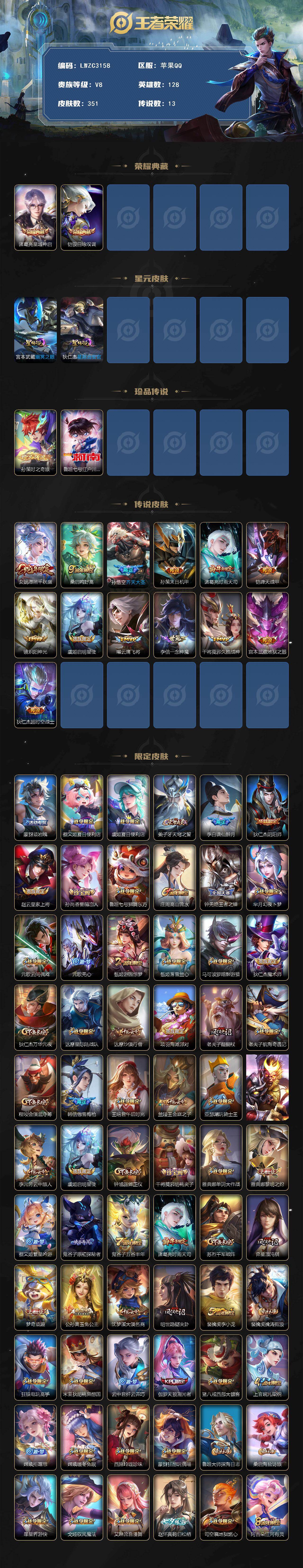 [17409324]【特价急出/详情看图】苹果Q-V8-最强王者段位-128英雄-351皮肤-2典藏皮肤-2珍品传说-2星元-13传说-97史诗