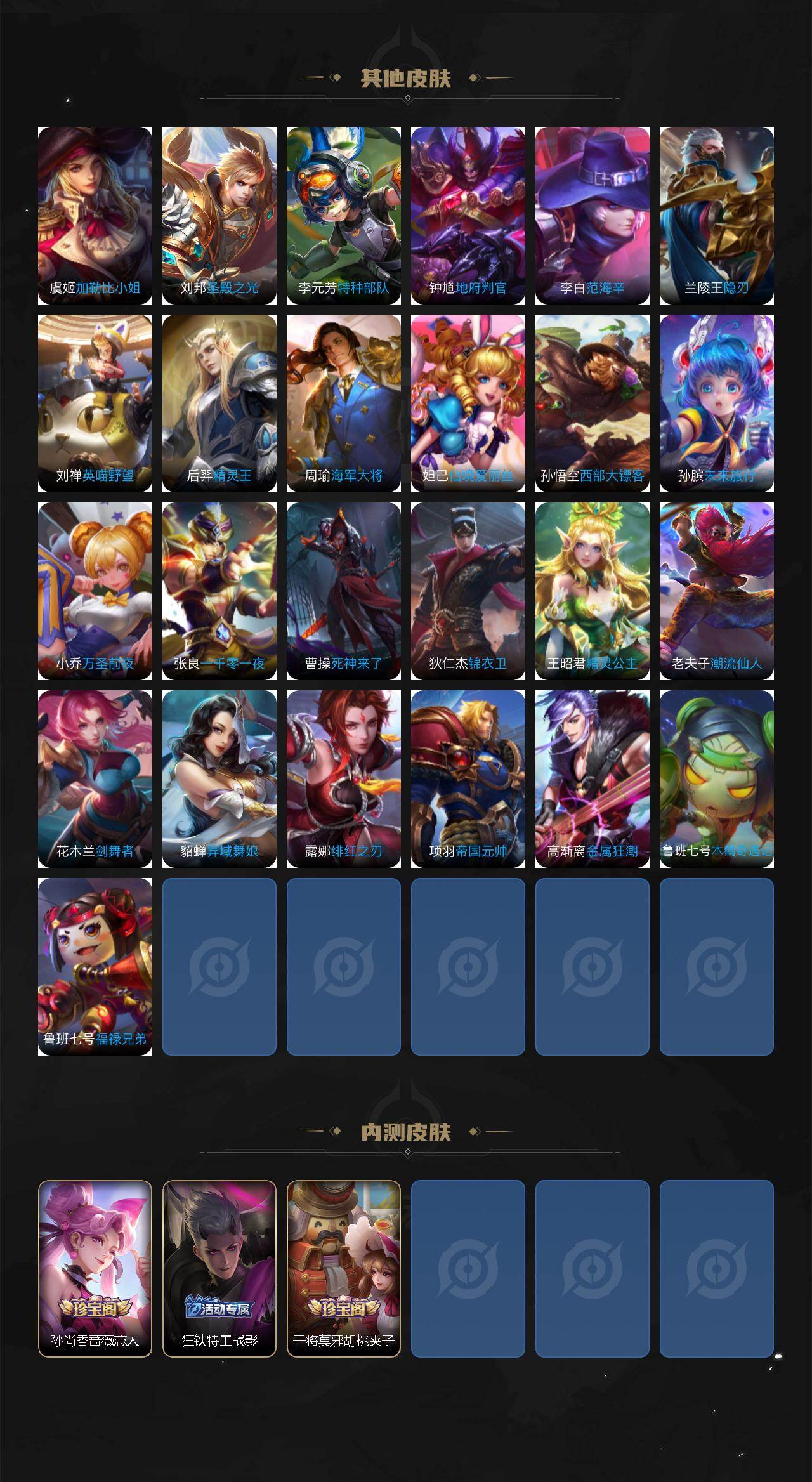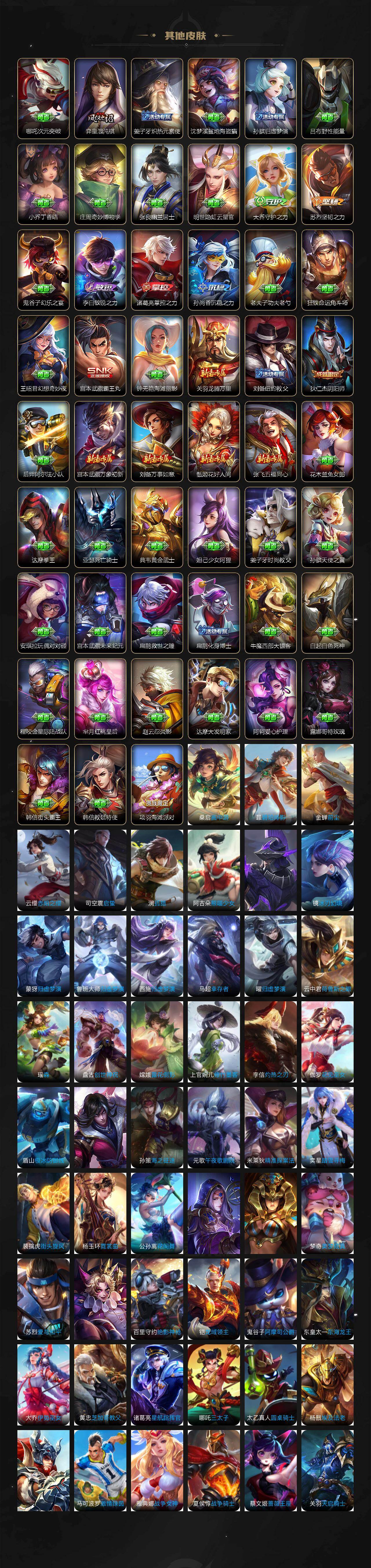 小乔青蛇,娜可露露晚萤,伽罗箭羽风息,李元芳逐浪之夏,不知火舞魅语,大乔猫狗日记,孙策猫狗日记,阿轲节奏热浪,露娜紫霞仙子,诸葛亮黄金分割率,王昭君偶像歌手,孙尚香时之恋人,雅典娜冰冠公主,吕布末日机甲,橘右京修罗,嬴政摇滚巨星,刘禅天才门将,白起星夜王子,安琪拉心灵骇客,程咬金功夫厨神,刘邦德古拉伯爵,兰陵王暗隐猎兽者,曹操幽灵船长,宫本武藏鬼剑武藏,亚瑟心灵战警,钟馗乐园奇幻夜,杨戬天秀·启明,蔡文姬舞动绿茵,廉颇地狱岩魂,小乔缤纷独角兽,夏侯惇乘风破浪,花木兰水晶猎龙者,铠曙光守护者,墨子金属风暴,吕布圣诞狂欢,貂蝉圣诞恋歌,百里守约特工魅影,嫦娥拒霜思,雅典娜黎明之约,李白千年之狐,夏洛特永昼,杨玉环银翎春语,赵怀真鹤归松栖,蒙犽百解令,周瑜雪夜绮愿,高渐离燃音魔法,李白谪仙醉月,赵怀真器灵·浮梦炉