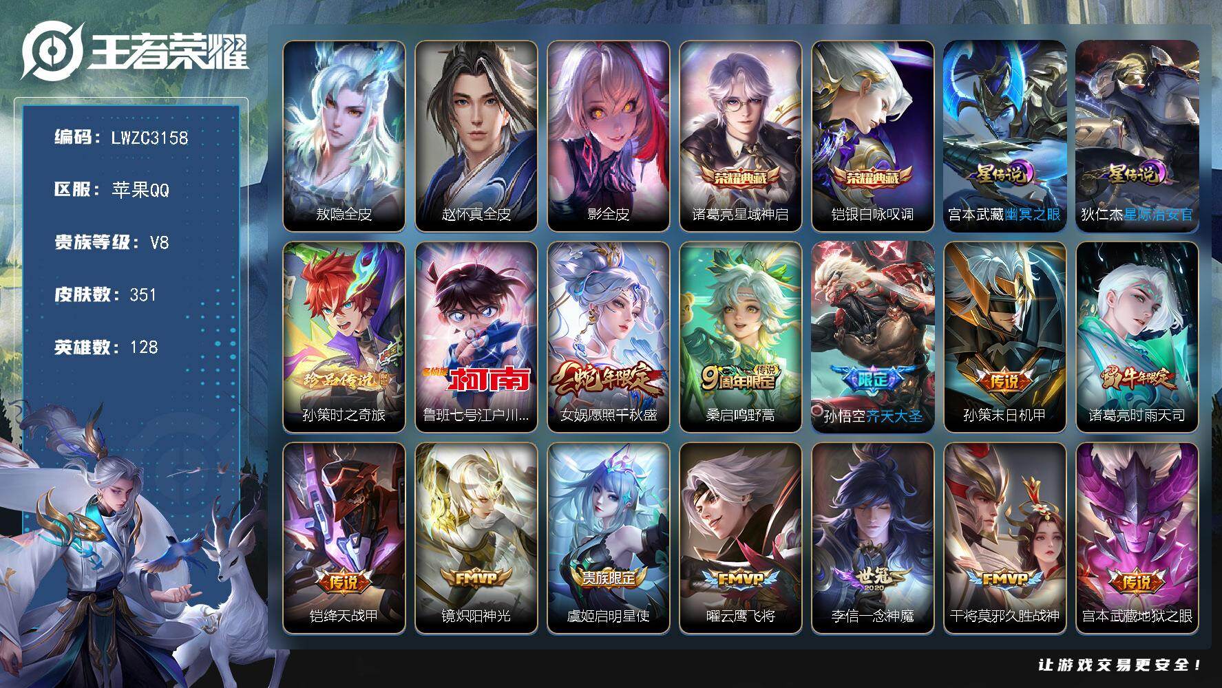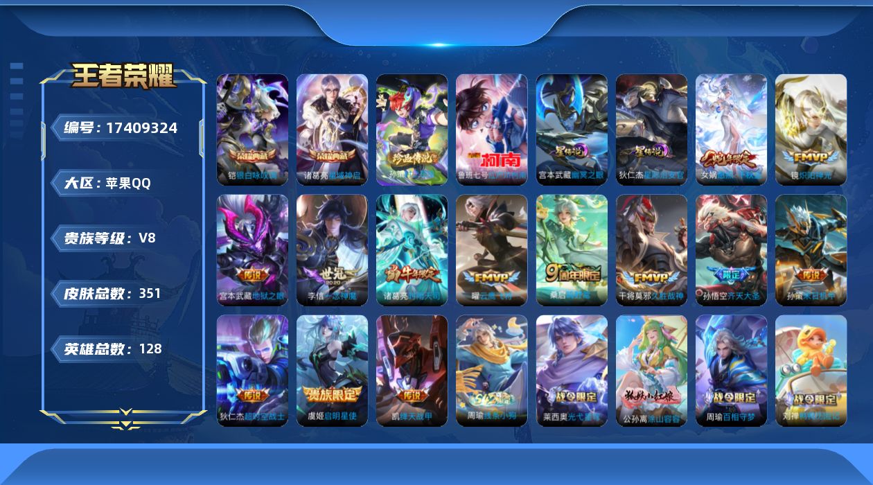 [17409324]【特价急出/详情看图】苹果Q-V8-最强王者段位-128英雄-351皮肤-2典藏皮肤-2珍品传说-2星元-13传说-97史诗 【英雄全皮】:敖隐全皮,赵怀真全皮,影全皮 【荣耀典藏】:诸葛亮星域神启,铠银白咏叹调 【珍品传说】:孙策时之奇旅,鲁班七号江户川柯南 【传说皮肤】:女娲愿照千秋盛,桑启鸣野蒿,孙悟空齐天大圣,孙策末日机甲,诸葛亮时雨天司,铠绛天战甲,镜炽阳神光,虞姬启明星使,曜云鹰飞将,李信一念神魔,干将莫邪久胜战神,宫本武藏地狱之眼,狄仁杰超时空战士 【限定皮肤】:蒙犽顽岩魄,蔡文姬夏日便利店,虞姬夏日便利店,姜子牙天穹之誓,李白谪仙醉月,狄仁杰阴阳师,赵云皇家上将,孙尚香蔷薇恋人,鲁班七号狮舞东方,庄周高山流水,钟无艳王者之锤,芈月幻夜卜梦,元歌云间偶戏,元歌无心,甄姬游园惊梦,甄姬落雪兰心,马可波罗暗影游猎,狄仁杰魔术师,狄仁杰万华元夜,达摩星际陆战队,达摩沙漠行僧,项羽海滩派对,老夫子醍醐杖,老夫子航海奇遇记,程咬金演武夺筹,韩信傲雪梅枪,王昭君午后时光,兰陵王金庭之子,亚瑟潮玩骑士王,孙悟空齐天大圣,李元芳云中旅人,虞姬启明星使,钟馗驱傩正仪,干将莫邪胡桃夹子,雅典娜单词大作战,雅典娜黎明之约,蔡文姬繁星吟游,鬼谷子原初探秘者,鬼谷子五谷丰年,诸葛亮时雨天司,苏烈千军破阵,弈星混沌棋,梦奇顽趣,公孙离玉兔公主,沈梦溪大漠名商,明世隐疑决卦,裴擒虎李小龙,裴擒虎擒涛扼浪,狂铁电玩高手,米莱狄胡桃异想国,云中君纤云弄巧,伽罗天狼溯光者,猪八戒西部大镖客,上官婉儿梁祝,嫦娥拒霜思,嫦娥暖冬兔眠,西施玲珑珍味,蒙犽狂想玩偶喵,鲁班大师探海日志,桑启海盐诗旅,暃星界游侠,戈娅驭风魔法,艾琳流音漫舞,赵怀真鹤归松栖,司空震地狱燃心,阿古朵江河有灵,张良古海寻踪,蒙犽百解令,蒙恬荣光圣徽,高渐离燃音魔法,妲己灵卜魔法,鬼谷子天穹祈灯,姬小满妄想食味,沈梦溪龙舞盛年,李元芳蔬乡物语,刘邦剑破天穹,程咬金群星魔术团,镜青焰无极,项羽苍威无极,周瑜熔金海岸 【年限皮肤】:诸葛亮时雨天司,女娲愿照千秋盛 【赛季限定】:弈星混沌棋,明世隐疑决卦,老夫子醍醐杖,鬼谷子原初探秘者,狄仁杰万华元夜,程咬金演武夺筹,钟馗驱傩正仪,苏烈千军破阵,达摩沙漠行僧,兰陵王金庭之子,沈梦溪大漠名商,李元芳云中旅人,桑启海盐诗旅,裴擒虎擒涛扼浪,鲁班大师探海日志,张良古海寻踪,鬼谷子天穹