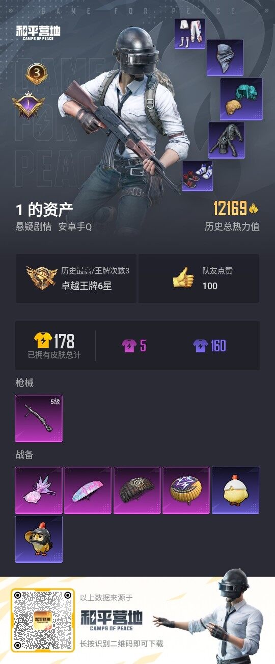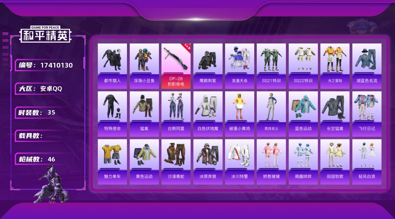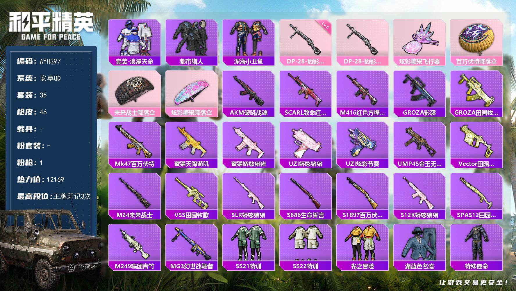 [17410130]安卓 手Q-0粉装-1特效枪-0载具-1粉色飞行器-12169热力值-3王牌印记-35套装-46枪皮