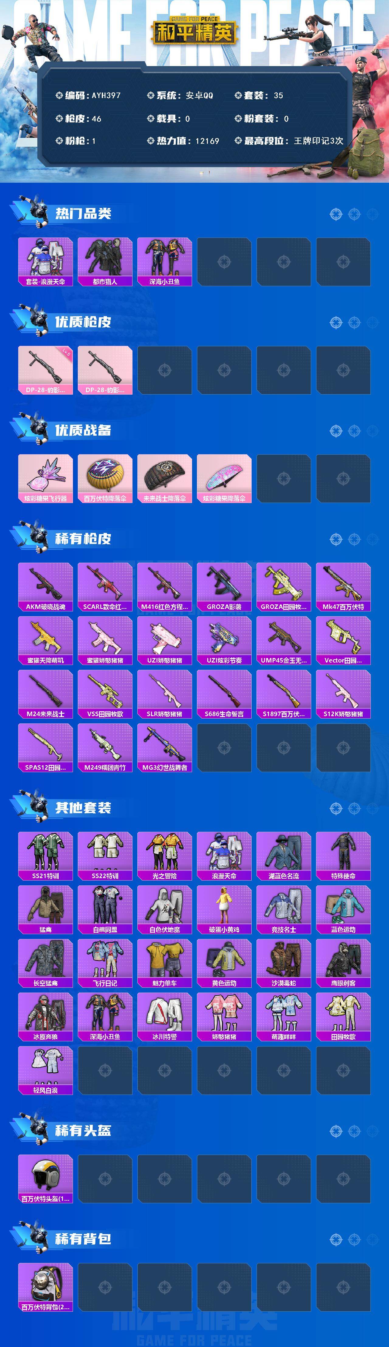 [17410130]安卓 手Q-0粉装-1特效枪-0载具-1粉色飞行器-12169热力值-3王牌印记-35套装-46枪皮 【热门品类】:套装-浪漫天命,套装-都市猎人,套装-深海小丑鱼 【粉色枪皮等级】:DP-28-豹影疾电(五级) 【粉色枪皮】:DP-28-豹影疾电 【粉色飞行器】:炫彩糖果飞行器 【粉色降落伞】:百万伏特降落伞,未来战士降落伞,炫彩糖果降落伞 【稀有套装】:套装-雪国风尚 【稀有枪皮】:AKM-破晓战魂,SCAR-L-致命红樱,M416-红色方程式,GROZA-影袭,GROZA-田园牧歌,Mk47-百万伏特,蜜獾-天降萌叽,蜜獾-娇憨猪猪,UZI-娇憨猪猪,UZI-炫彩节奏,UMP45-金玉无双,Vector-田园牧歌,M24-未来战士,VSS-田园牧歌,SLR-娇憨猪猪,S686-生命誓言,S1897-百万伏特,S12K-娇憨猪猪,SPAS-12-田园牧歌,M249-糯团青竹,MG3-幻世战舞者 【其他套装】:套装-SS21特训,套装-SS22特训,套装-光之冒险,套装-浪漫天命,套装-湖蓝色名流,套装-特殊使命,套装-猛禽,套装-白熊同盟,套装-白色伏地魔,套装-破蛋小黄鸡,套装-竞技名士,套装-蓝色运动,套装-长空猛禽,套装-飞行日记,套装-魅力单车,套装-黄色运动,套装-沙漠毒蛇,套装-鹰眼刺客,套装-冰原奔狼,套装-深海小丑鱼,套装-冰川特警,套装-娇憨猪猪,套装-萌趣咩咩,套装-田园牧歌,套装-轻风白浪 【稀有头盔】:百万伏特头盔(1级) 【稀有背包】:百万伏特背包(2级) 【营地ID】:920633529