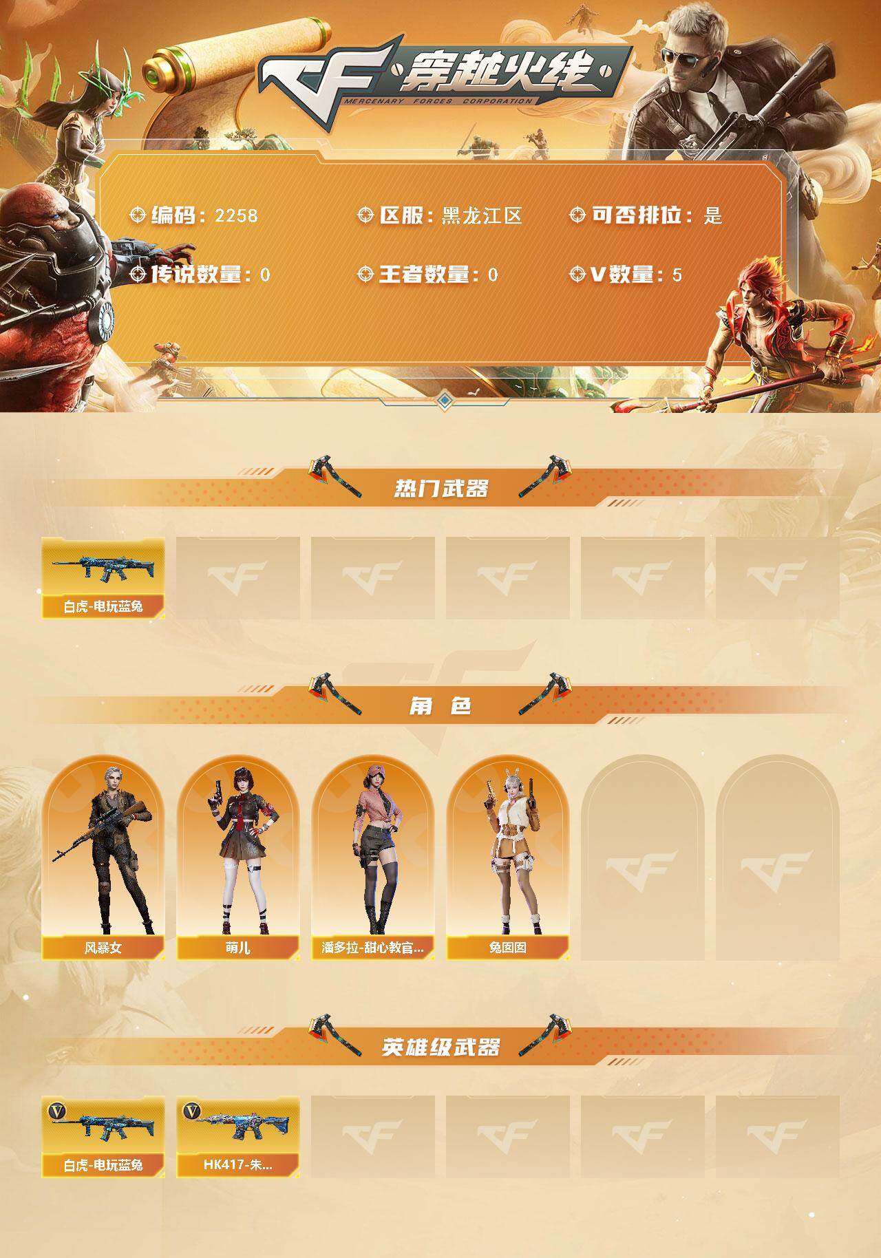 - [15249957]黑龙江区-65V-0王者-2炫金 【热门武器】:QBZ03-金色蔷薇*2,M4A1-青龙,死亡之眼,M4A1-黑骑士,加特林-炼狱,羊驼玩偶,沙鹰-修罗*2 【王者炫金武器】:炫金千变,炫金修罗 【音效卡】:AK47-火麒麟音效卡,Barrett-碧霄极光音效卡,AWM-昌龙-怀旧音效卡 【皮肤】:幻神-电流骇客 皮肤,金色蔷薇-破浪逐光 皮肤,雷神-星空,雷神-维纳斯皮肤,雷神-源计划2.0专属 皮肤,火麒麟-雷神,火麒麟-心动糖果,黑龙-能量核心,黑龙-暗月,无影-能量核心,修罗-能量核心,屠龙-荣耀之锋,屠龙-星火燎原 【角色】:葵,战地猎狐,奇洋探员,乔伊教练,修道士,云海玲珑,暗夜-X,北极狐-X,初恋灵狐,风暴女,虎妞,嘉年华灵狐,娟娟,葵-赛博朋克,灵狐者-X,龙儿-小淘气,麻雀,曼陀罗-X,女主播,潘多拉-X,邱刚敖,青霞仙子,蛇姬,斯沃特-X,甜心偶像,蜀雪,铁骑荣耀,维纳斯,雪莉杨,雪莉杨-摸金校尉,夜玫瑰-宠粉 【人偶武器】:AWM-灵狐-15周年嘉年华,海滩汪汪-巴雷特,M37-葵,迷你波特博士,迷你巨石泰坦-魔花研究所 【暴走生化】:死亡之眼,超级对讲机 【挑战大师】:冰龙粉碎者-白马银枪,神圣爆裂者-末日III 【英雄级武器】:AK47-火麒麟*2,M4A1-黑龙,M4A1-雷神*2,M4A1-黑骑士,AK47-无影,M4A1-死神,AK47-黑武士,AK12-天启,M4A1-龙血,M4A1-青龙,M4A1-神工天巧,无影-神兵利器,黑武士-锦绣游龙,FAMAS G2-天戎,QBZ03-金色蔷薇*2,AWM-天龙,Barrett-毁灭,AWM-裁决,VSK-94-金蚀,加特林-炼狱,沙鹰-修罗*2,沙鹰-天神*2,COP 357-云龙,屠龙*4,龙啸,擎天,麒麟刺,唐刀-神工天巧,高爆手雷-幻灵*2,高爆手雷-竞技荣光,高爆手雷-神工天巧*4,高爆手雷-云龙,手雷-热带奇洋,高爆手雷-古蛇迷踪,高爆手雷-玄豹,闪光弹-幻灵*3,闪光弹-竞技荣光,闪光弹-神工天巧*2,闪光弹-云龙*2,闪光弹-玄豹,烟雾弹-幻灵,烟雾弹-神工天巧*3,烟雾弹-云龙,烟雾弹-古蛇迷踪,烟雾弹-玄豹,M4A1-赤狱骑士,AWM-昌龙*2,Barrett-碧霄极光 【道具】:CFS限定背包,亚洲杯纪念炫彩背包,全能枪王背包,奇洋探员-海龟背包,炫彩背包,背包-