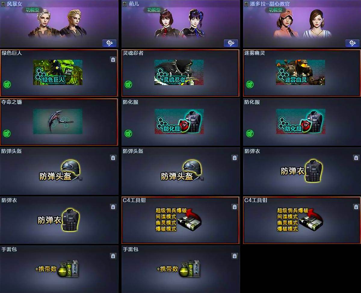 【道具】:绿色巨人,灵魂忍者,迷雾幽灵,夺命之镰,防化服*2,防弹头盔*2,防弹衣*2,C4工具钳*2,手雷包*2