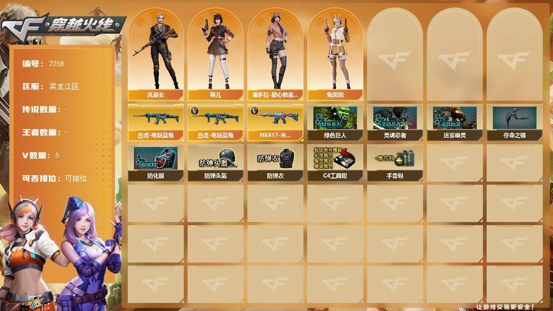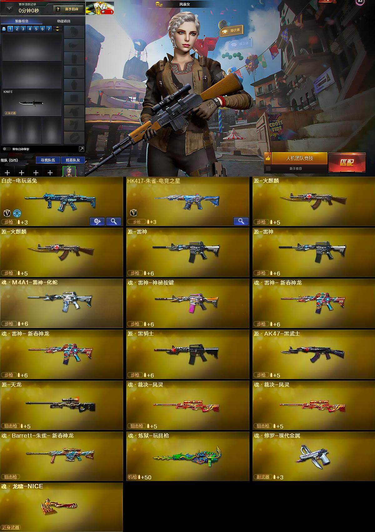 [17410743]黑龙江区-9V-0王者武器数-0炫金武器数 【热门武器】:白虎-电玩蓝兔 【角色】:风暴女,萌儿,潘多拉-甜心教官,兔囡囡 【英雄级武器】:白虎-电玩蓝兔,HK417-朱雀-电竞之星 【道具】:绿色巨人,灵魂忍者,迷雾幽灵,夺命之镰,防化服*2,防弹头盔*2,防弹衣*2,C4工具钳*2,手雷包*2 【特殊枪械】:
