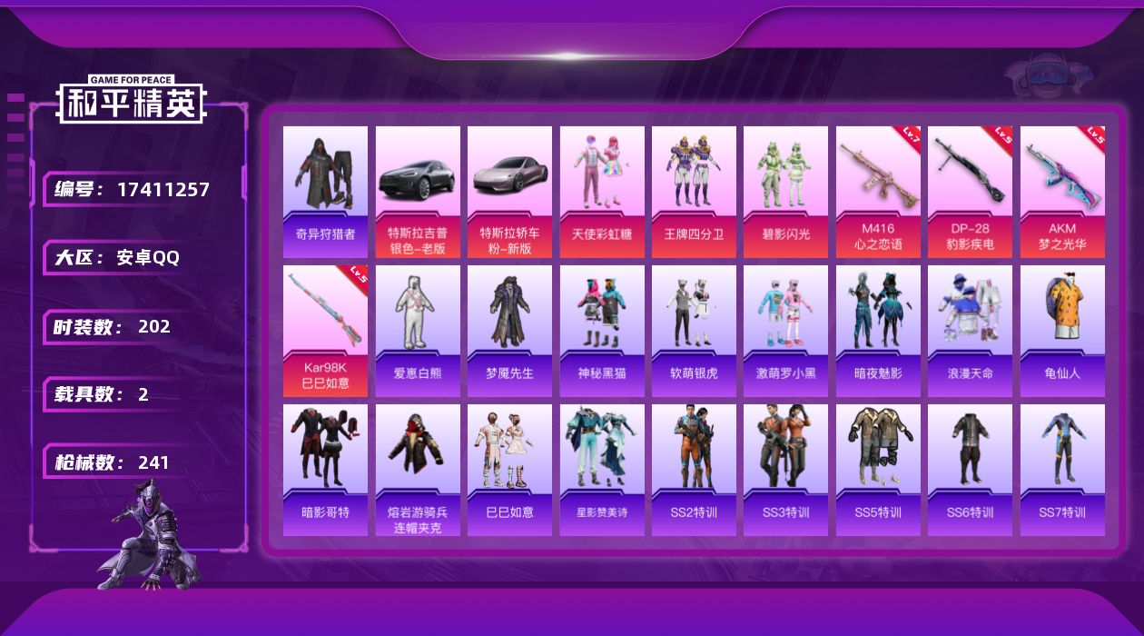 [17411257]【特价出售/店主推荐】安卓 手Q-3粉装-4特效枪-2载具-0粉色飞行器-73432热力值-13王牌印记-202套装-241枪皮 【热门品类】:套装-浪漫天命,套装-奇异狩猎者,套装-龟仙人,套装-暗影哥特,熔岩游骑兵连帽夹克 【粉色套装】:粉装-天使彩虹糖,粉装-王牌四分卫,粉装-碧影闪光 【粉色枪皮等级】:AKM-梦之光华(五级),M416-心之恋语(七级),Kar98K-巳巳如意(五级),DP-28-豹影疾电(五级) 【粉色载具】:特斯拉Model X(冷光银),特斯拉Roadster(沁心粉) 【粉色枪皮】:AKM-梦之光华,M416-心之恋语,Kar98K-巳巳如意,DP-28-豹影疾电 【粉色降落伞】:春暖花开降落伞,梦幻火箭降落伞,古堡领主降落伞,繁花小夜曲降落伞,葫芦兄弟降落伞 【稀有套装】:套装-龟仙人,套装-巳巳如意,套装-星影赞美诗 【稀有枪皮】:AKM-冰凉西瓜,AKM-夜灯,AKM-奇异狩猎者,AKM-彩虹符号,AKM-折纸暴龙,AKM-灼热熔岩,AKM-玉龙,AKM-生命誓言,AKM-破晓战魂,AKM-萌趣颜团子,AKM-虎虎生威,AKM-霓虹街区,AKM-龙的传人,M16A4-夜灯,M16A4-幻世战舞者,SCAR-L-凝视深渊,SCAR-L-炫彩节奏,SCAR-L-玉兔迎春,SCAR-L-红色方程式,SCAR-L-黄金龙骨,M416-仓鼠灰灰,M416-夜灯,M416-神秘黑猫,M416-糯团青竹,M416-红色方程式,M416-罗小黑,M416-蓝色火焰,GROZA-异彩先驱,GROZA-彩虹符号,GROZA-懵萌河马,GROZA-治愈之星,GROZA-生命誓言,GROZA-田园牧歌,GROZA-蓝莓炮弹,GROZA-黑色刀锋,AUG-凝视深渊,AUG-天降萌叽,AUG-闲梦青缨,AUG-青春冒险家,QBZ-原初圣火,QBZ-彩虹符号,M762-彩虹符号,M762-牛气冲天,M762-瑞龙福将,M762-甜心宝贝,M762-绯红前夜,M762-诡娃娃,M762-镭射皇者,Mk47-百万伏特,Mk47-青春冒险家,G36C-不夜海上花,G36C-懵萌河马,G36C-时空追击者,AC-VAL-天降萌叽,蜜獾-垂柳戏鸭,蜜獾-天降萌叽,蜜獾-娇憨猪猪,UZI-众神之王,UZI-啾咪啾咪,UZI-天降萌叽,UZI-娇憨猪猪,UZI-影袭,