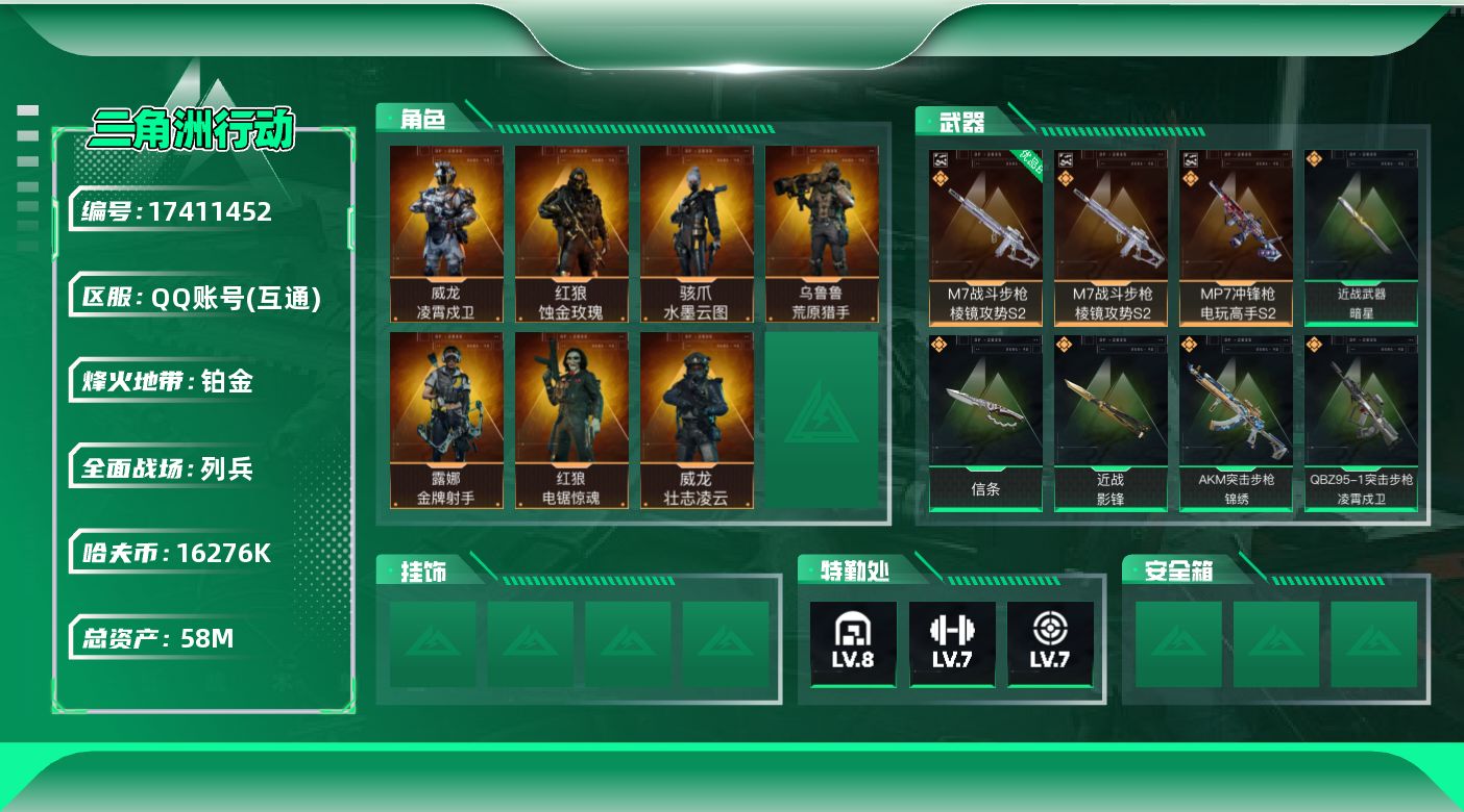 [17411452]带3267三角券|三优品典藏枪皮【特价出售/店主推荐】58m总资产-16276k哈伏币-60烽火等级-铂金-25战场等级-列兵 【干员外观】:红狼-蚀金玫瑰,骇爪-水墨云图,威龙-凌霄戍卫,威龙-壮志凌云,红狼-电锯惊魂,露娜-金牌射手,乌鲁鲁-荒原猎手 【近战皮肤】:近战-暗星,近战-信条,近战-影锋,近战-处刑者2级,近战-黑鹰 【典藏外观】:M7战斗步枪-棱镜攻势S2,M250通用机枪-电玩高手S2,MP7冲锋枪-电玩高手S2 【典藏外观成色】:M7战斗步枪-棱镜攻势S2(优品B),M250通用机枪-电玩高手S2(优品S),MP7冲锋枪-电玩高手S2(优品B) 【传说外观】:M4A1突击步枪-蚀金玫瑰,M4A1突击步枪-阿米娅,AKM突击步枪-锦绣,QBZ95-1突击步枪-凌霄戍卫,ASh-12战斗步枪-鹅鸭杀,K416突击步枪-行动记录,SG552突击步枪-运动员,SCAR-H战斗步枪-铁艺苍穹,SCAR-H战斗步枪-水墨云图,SCAR-H战斗步枪-启航,CAR-15突击步枪-黑鹰坠落,CAR-15突击步枪-阿米娅,AS Val突击步枪-蛇年祥瑞,腾龙突击步枪-万金泪冠,K437突击步枪-锦绣,KC17突击步枪-电锯惊魂,MK47突击步枪-暗星,P90冲锋枪-信条,SMG-45冲锋枪-骑士,SMG-45冲锋枪-锦绣,SR-3M紧凑突击步枪-暗星,勇士冲锋枪-能天使-午夜邮差,勇士冲锋枪-万金泪冠,QCQ171冲锋枪-鹅鸭杀,QJB201轻机枪-鹅鸭杀,M14射手步枪-蛮荒,M14射手步枪-缄花,SR-25射手步枪-水墨云图,SR-25射手步枪-信条,SR-25射手步枪-缄花,AWM狙击步枪-万金泪冠,.357左轮-缄花,复合弓-黑·天际线 【史诗外观】:M4A1突击步枪-特勤执行,AKM突击步枪-林中猎手,QBZ95-1突击步枪-曙光,QBZ95-1突击步枪-ACE,K416突击步枪-冬日风情,K416突击步枪-腊梅,K416突击步枪-阿萨拉特攻,AUG突击步枪-战术迷彩,AUG突击步枪-蝮蛇,AUG突击步枪-特勤执行,M7战斗步枪-百步穿杨,SG552突击步枪-深海恐惧,SG552突击步枪-哈夫克警备,SCAR-H战斗步枪-囚徒,G3战斗步枪-流沙送葬,G3战斗步枪-哈夫克警备,PTR-32突击步枪-ACE,AS Val突击步枪-百步穿杨,腾龙突击步枪-