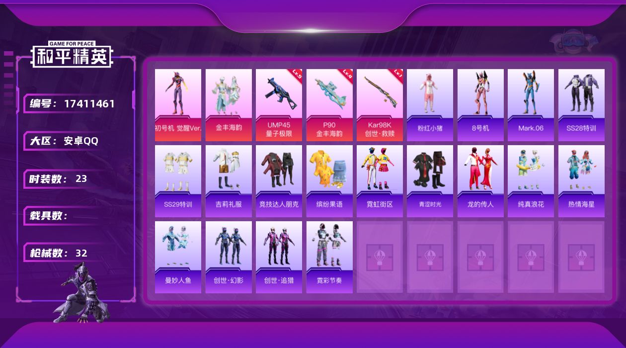 [17411461]【特价出售/店主推荐】安卓 手Q-2粉装-3特效枪-0载具-0粉色飞行器-9535热力值-2王牌印记-23套装-32枪皮 【热门品类】:套装-粉红小猪,角色-8号机,角色-Mark.06 【粉色套装】:角色-初号机 觉醒Ver.,粉装-金丰海韵 【粉色枪皮等级】:UMP45-量子极限(五级),P90-金丰海韵(四级),Kar98K-创世·救赎(一级) 【粉色枪皮】:UMP45-量子极限,P90-金丰海韵,Kar98K-创世·救赎 【粉色降落伞】:创世·救赎降落伞,初号机 觉醒Ver.降落伞 【稀有枪皮】:SCAR-L-炫彩节奏,M416-蓝色火焰,AUG-耀粉歌者,QBZ-彩虹符号,M762-天降萌叽,Vector-创世·救赎,Kar98K-彩虹符号,DBS-创世·救赎,MG3-幻世战舞者 【其他套装】:套装-SS28特训,套装-SS29特训,套装-吉莉礼服,套装-竞技达人朋克,套装-粉红小猪,套装-缤纷果语,套装-霓虹街区,套装-青涩时光,套装-龙的传人,套装-纯真浪花,套装-热情海星,套装-曼妙人鱼,套装-创世·幻影,套装-创世·追猎,套装-霓彩节奏,角色-8号机,角色-Mark.06 【营地ID】:1047195470