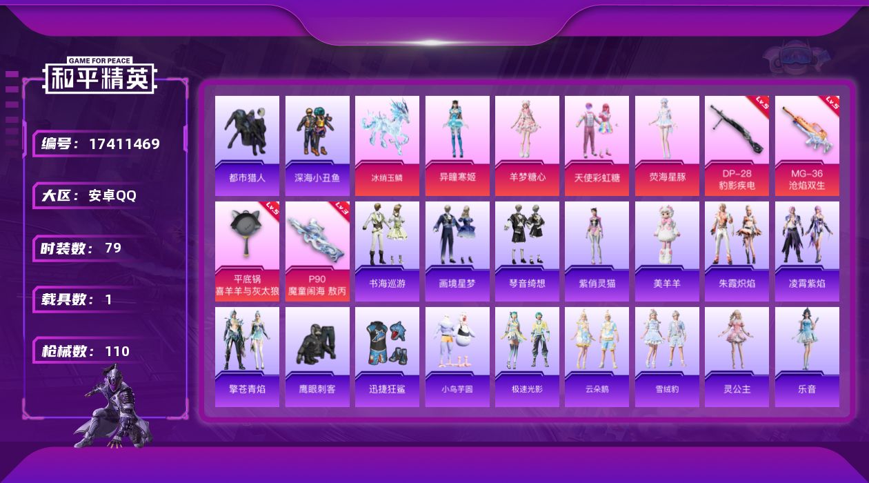 [17411469]【店主推荐捡漏号!可直接换绑】安卓 手Q-4粉装-6特效枪-1载具-3粉色飞行器-34982热力值-6王牌印记-79套装-110枪皮【热门品类】:套装-都市猎人,套装-深海小丑鱼【粉色套装】:粉装-天使彩虹糖,角色-荧海星豚,角色-羊梦糖心,角色-异瞳寒姬【粉色枪皮等级】:AKS-74U-森灵之息(五级),P90-魔童闹海 敖丙(三级),Mk14-福马献瑞(五级),DP-28-豹影疾电(五级),MG-36-沧焰双生(五级),平底锅-喜羊羊与灰太狼(七级)【粉色载具】:冰绡玉鳞【粉色枪皮】:AKS-74U-森灵之息,P90-魔童闹海 敖丙,Mk14-福马献瑞,DP-28-豹影疾电,MG-36-沧焰双生,平底锅-喜羊羊与灰太狼【粉色飞行器】:炫彩糖果飞行器,灵珠游龙飞行器,暮色之舞飞行器