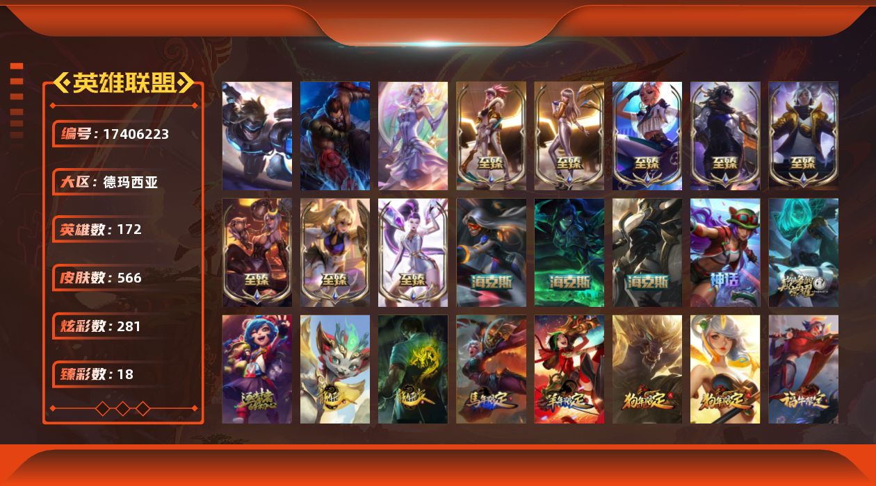 [17406223]未定级段位-172英雄-566皮肤-281炫彩-3终极-15神话-101限定-73传说-127史诗