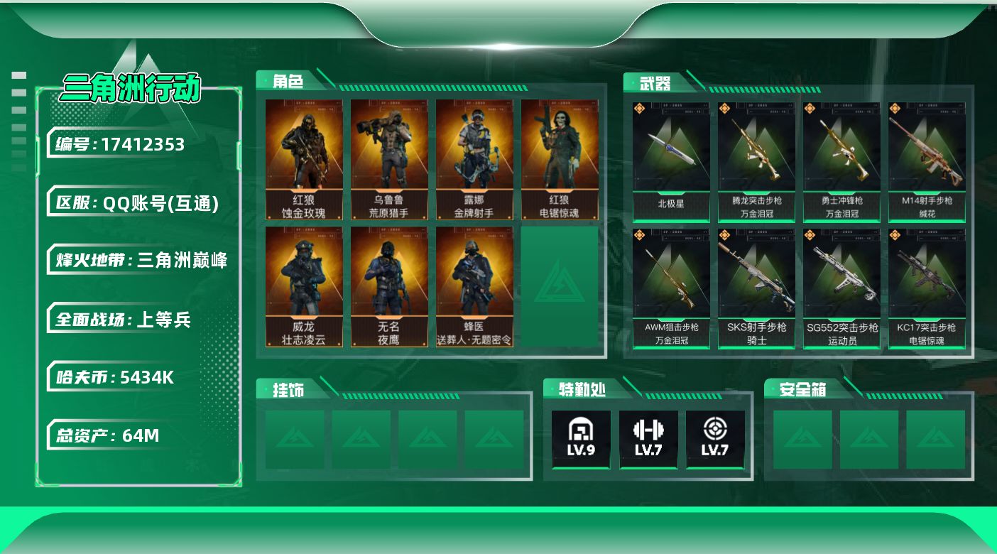 [17412353]64m总资产-5434k哈伏币-60烽火等级-三角洲巅峰-17战场等级-上等兵 【干员外观】:红狼-蚀金玫瑰,威龙-壮志凌云,蜂医-送葬人·无题密令,无名-夜鹰,红狼-电锯惊魂,露娜-金牌射手,乌鲁鲁-荒原猎手 【近战皮肤】:近战-北极星,近战-黑鹰 【传说外观】:M4A1突击步枪-蚀金玫瑰,M4A1突击步枪-阿米娅,SG552突击步枪-运动员,AK-12突击步枪-夜鹰,SCAR-H战斗步枪-铁艺苍穹,SCAR-H战斗步枪-启航,SCAR-H战斗步枪-荼蘼,腾龙突击步枪-捞点薯条,腾龙突击步枪-万金泪冠,K437突击步枪-北极星,KC17突击步枪-电锯惊魂,SMG-45冲锋枪-骑士,SR-3M紧凑突击步枪-荼蘼,勇士冲锋枪-能天使-午夜邮差,勇士冲锋枪-万金泪冠,QCQ171冲锋枪-北极星,725双管霰弹枪-送葬人-无题密令,PKM通用机枪-荼蘼,M250通用机枪-骑士之心,M14射手步枪-蛮荒,M14射手步枪-缄花,SKS射手步枪-骑士,AWM狙击步枪-捞点薯条,AWM狙击步枪-万金泪冠,93R-捞点薯条,复合弓-黑·天际线 【史诗外观】:K416突击步枪-潜袭者,KC17突击步枪-碎冰行动,M4A1突击步枪-特勤执行,AKM突击步枪-林中猎手,QBZ95-1突击步枪-曙光,QBZ95-1突击步枪-ACE,ASh-12战斗步枪-守夜人,K416突击步枪-冬日风情,K416突击步枪-腊梅,M16A4突击步枪-竞赛选手,AUG突击步枪-战术迷彩,AUG突击步枪-蝮蛇,AUG突击步枪-特勤执行,M7战斗步枪-百步穿杨,SG552突击步枪-尖端治疗,SG552突击步枪-深海恐惧,G3战斗步枪-战场英杰,G3战斗步枪-流沙送葬,G3战斗步枪-哈夫克警备,PTR-32突击步枪-ACE,AS Val突击步枪-尖端治疗,AS Val突击步枪-百步穿杨,腾龙突击步枪-无垢,腾龙突击步枪-猎鳄行动,K437突击步枪-丛影谍踪,MP5冲锋枪-深海恐惧,MP5冲锋枪-竞技风,Vector冲锋枪-阿萨拉文明,Vector冲锋枪-红色彗星,Vector冲锋枪-猎鳄行动,Vector冲锋枪-百步穿杨,SMG-45冲锋枪-阿萨拉特攻,SR-3M紧凑突击步枪-荒野求生,SR-3M紧凑突击步枪-开工大吉,勇士冲锋枪-深海恐惧,勇士冲锋枪-丛影谍踪,MP7冲锋枪-无垢,MP7冲锋枪-六套之力,M10