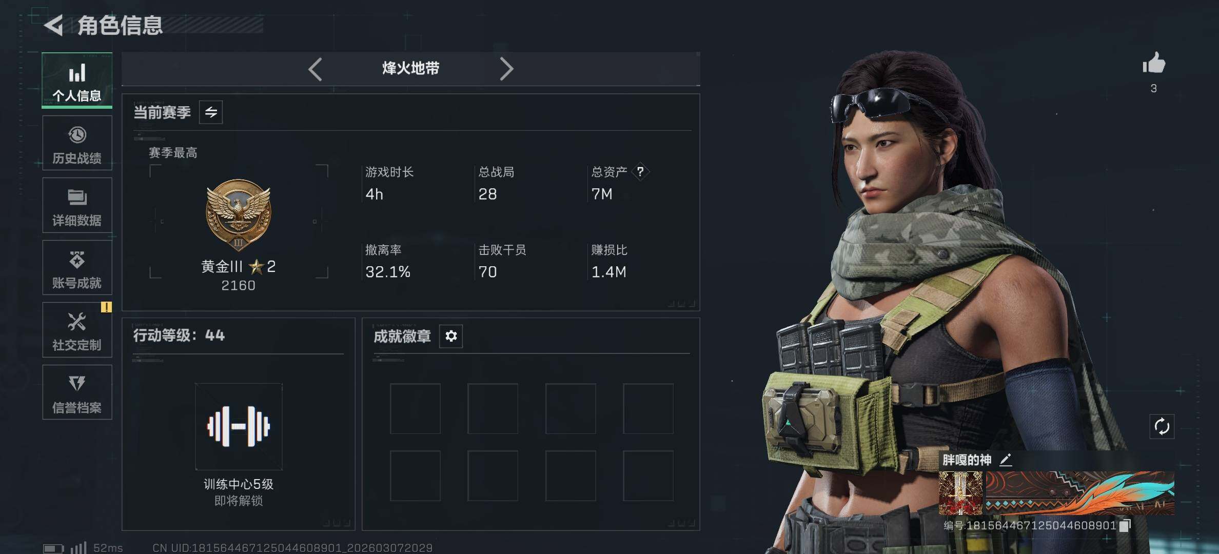 [17412357]7m总资产-791k哈伏币-44烽火等级-黄金-1战场等级-无军衔