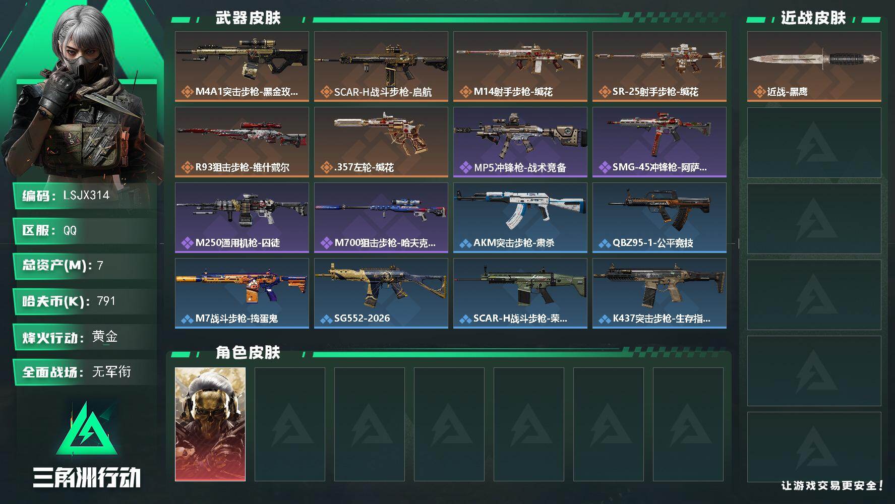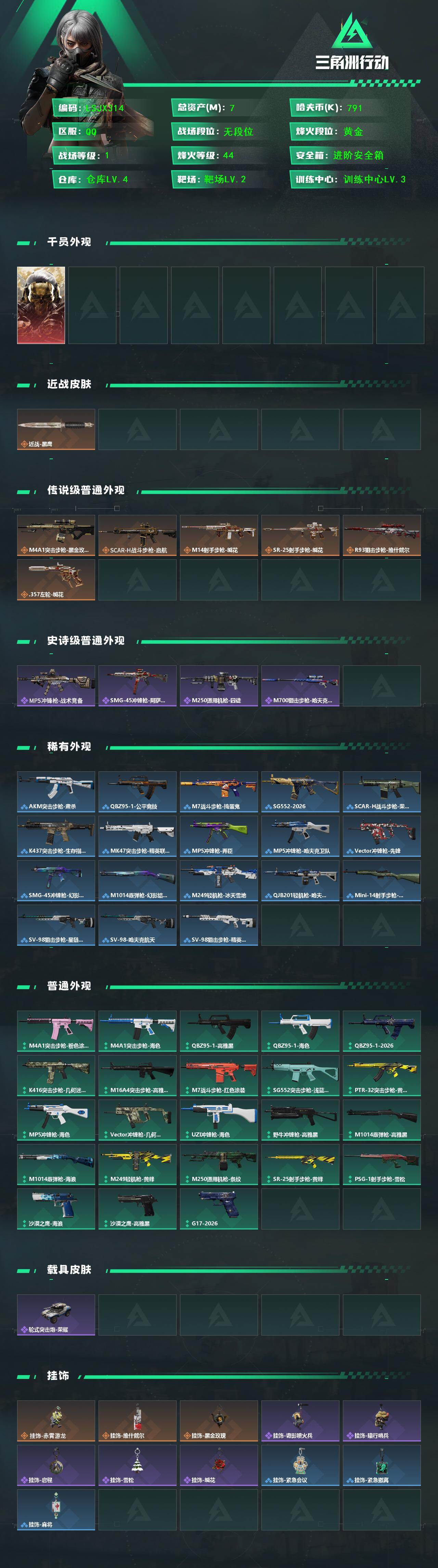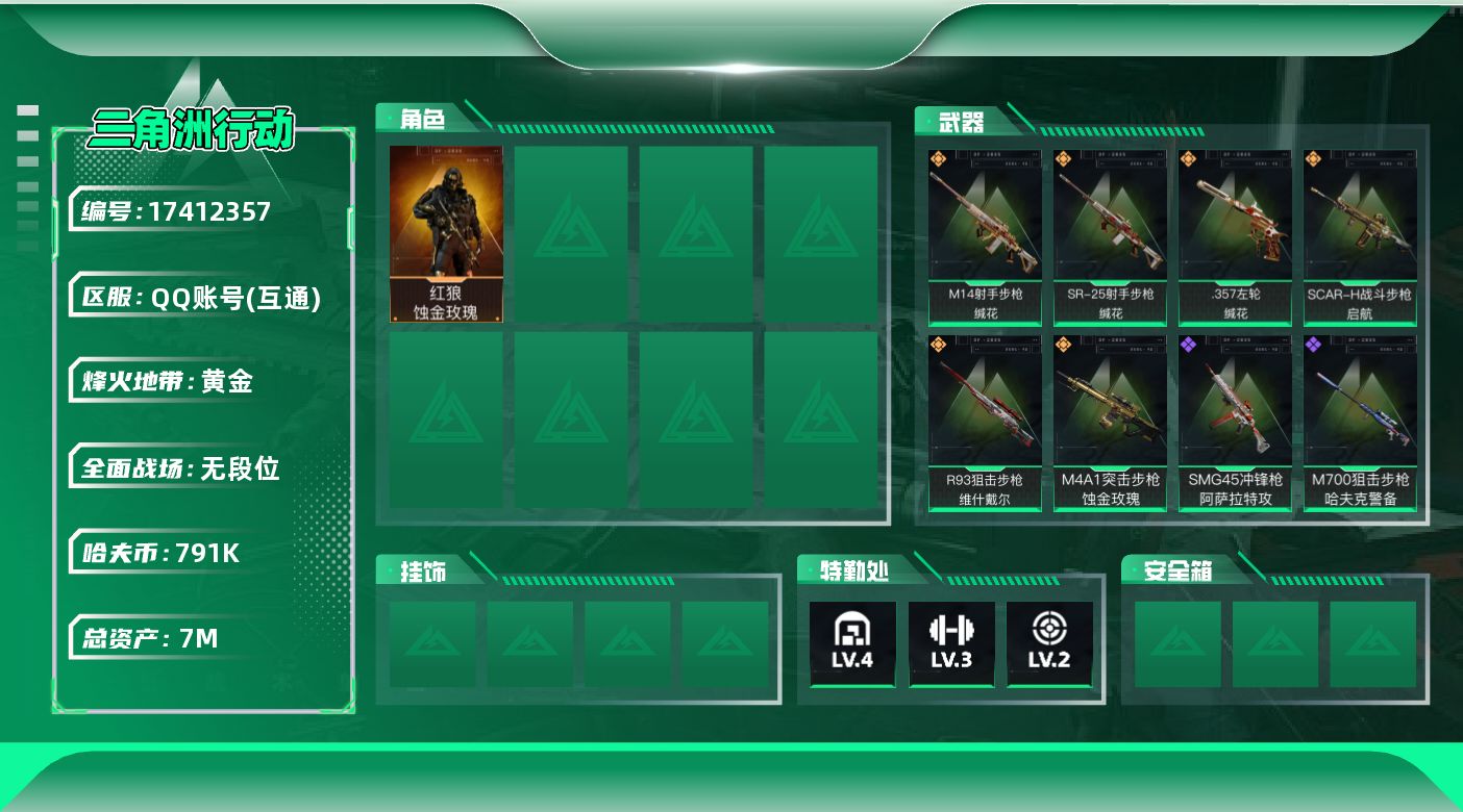 [17412357]7m总资产-791k哈伏币-44烽火等级-黄金-1战场等级-无军衔 【干员外观】:红狼-蚀金玫瑰 【近战皮肤】:近战-黑鹰 【传说外观】:M4A1突击步枪-蚀金玫瑰,SCAR-H战斗步枪-启航,M14射手步枪-缄花,SR-25射手步枪-缄花,R93狙击步枪-维什戴尔,.357左轮-缄花 【史诗外观】:MP5冲锋枪-战术竞备,SMG-45冲锋枪-阿萨拉特攻,M250通用机枪-囚徒,M700狙击步枪-哈夫克警备 【稀有外观】:AKM突击步枪-肃杀,QBZ95-1突击步枪-公平竞技,M7战斗步枪-捣蛋鬼,SG552突击步枪-2026,SCAR-H战斗步枪-荣耀列队,K437突击步枪-生存指令,MK47突击步枪-精英联盟,MP5冲锋枪-弄臣,MP5冲锋枪-哈夫克卫队,Vector冲锋枪-先锋,SMG-45冲锋枪-幻影结构,M1014霰弹枪-幻影结构,M249轻机枪-冰天雪地,QJB201轻机枪-哈夫克卫队,Mini-14射手步枪-荣耀列队,SV-98狙击步枪-星链科技,SV-98狙击步枪-哈夫克航天,SV-98狙击步枪-精英联盟,QSZ92G-一帆风顺 【普通外观】:M4A1突击步枪-粉色涂装,M4A1突击步枪-海色,QBZ95-1突击步枪-高雅黑,QBZ95-1突击步枪-海色,QBZ95-1突击步枪-2026,K416突击步枪-几何迷彩,M16A4突击步枪-高雅黑,M7战斗步枪-红色涂装,M7战斗步枪-黑巧甜心,SG552突击步枪-浅蓝涂装,SG552突击步枪-狂欢,PTR-32突击步枪-黄蜂,CAR-15突击步枪-狂欢,AS Val突击步枪-黑巧甜心,MP5冲锋枪-海色,Vector冲锋枪-几何迷彩,UZI冲锋枪-海色,野牛冲锋枪-高雅黑,M1014霰弹枪-高雅黑,M1014霰弹枪-海浪,PKM通用机枪-变色龙,M249轻机枪-黄蜂,M250通用机枪-条纹,SR-25射手步枪-黄蜂,SR-25射手步枪-黑巧甜心,PSG-1射手步枪-雪松,沙漠之鹰-海浪,沙漠之鹰-高雅黑,G17-2026 【载具外观】:轮式突击炮-荣耀 【挂饰】:挂饰-赤霄游龙,挂饰-维什戴尔,挂饰-蚀金玫瑰,挂饰-诡影喷火兵*4,挂饰-暗行哨兵*4,挂饰-启程,挂饰-雪松,挂饰-缄花,挂饰-紧急会议*6,挂饰-紧急撤离*15,挂饰-麻将
