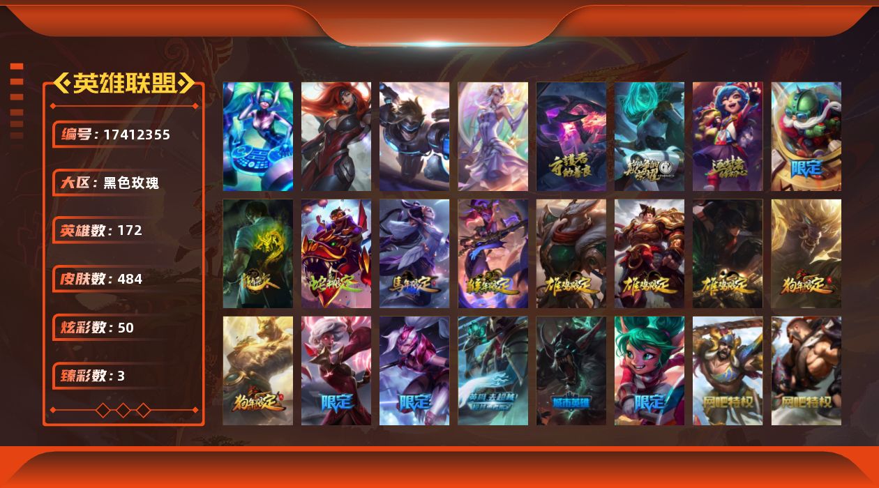 [17412355]未定级段位-172英雄-484皮肤-50炫彩-4终极-3神话-117限定-59传说-117史诗