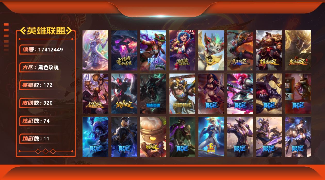 黄金段位-172英雄-320皮肤-74炫彩-1终极-4神话-46限定-21传说-79史诗