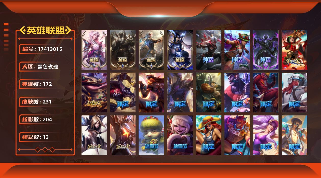 [17413015]未定级段位-172英雄-231皮肤-204炫彩-0终极-9神话-25限定-20传说-36史诗