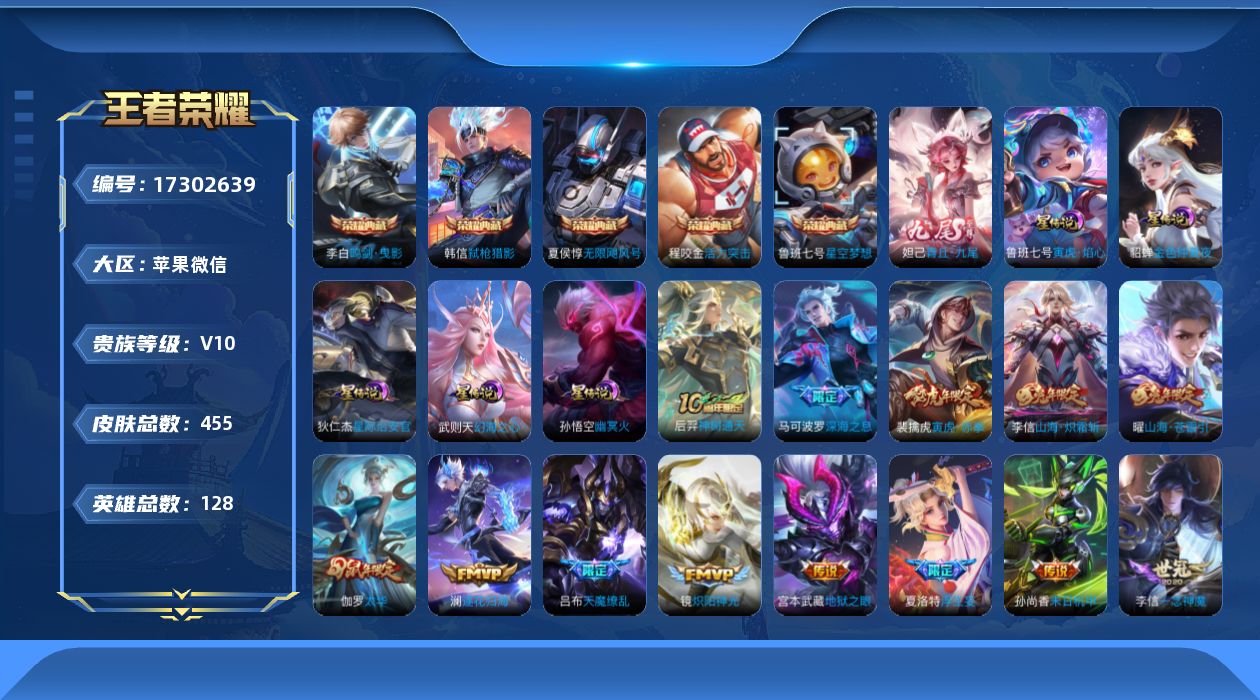 [17302639]苹果WX-V10-最强王者段位-128英雄-450皮肤-5典藏皮肤-1典藏英雄-1无双-50传说-146史诗-5星传说