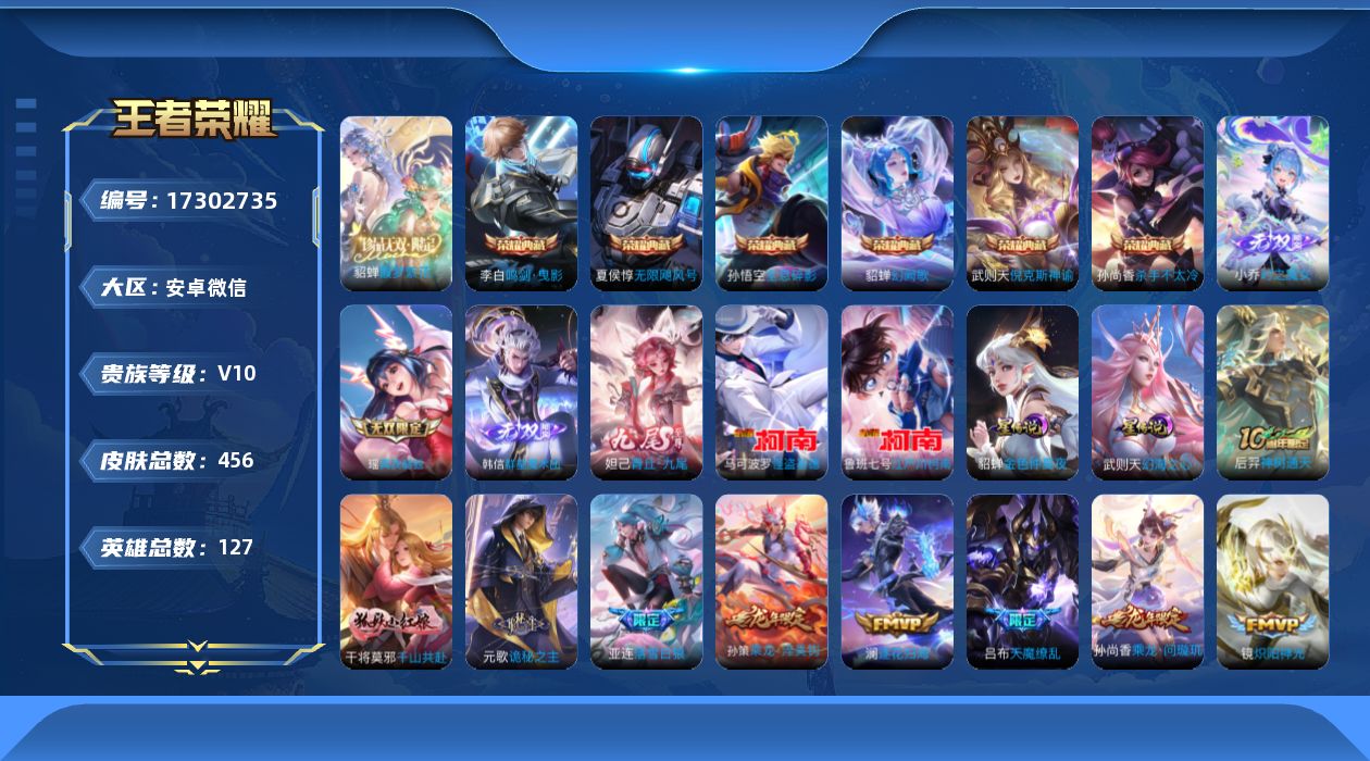 [17302735]安卓WX-青铜小兵!-V10-至尊星耀IV段位-127英雄-456皮肤-6典藏皮肤-1典藏英雄-1珍品无双-4无双-2珍品传说-67传说-143史诗