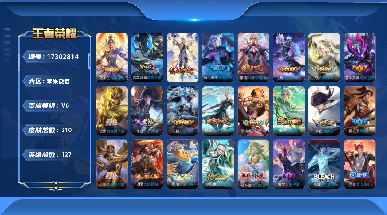 [17302814]苹果WX-V6-最强王者段位-127英雄-210皮肤-1典藏皮肤-15传说-49史诗