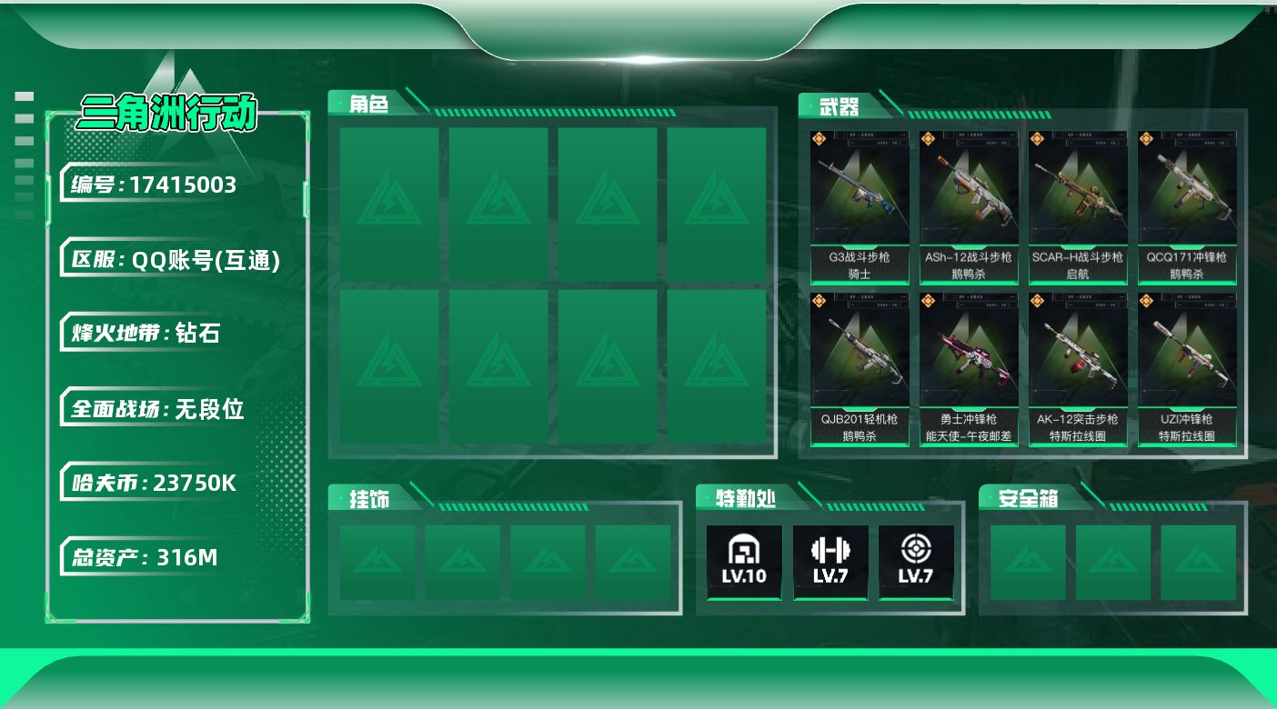 [17415003]【店主推荐捡漏号!可直接换绑】23750k哈伏币-248m流动资产-60烽火等级-钻石-1战场等级-无军衔 资产316m【近战皮肤】:近战-黑鹰 【传说外观】:M4A1突击步枪-蚀金玫瑰,M4A1突击步枪-阿米娅,ASh-12战斗步枪-鹅鸭杀,M16A4突击步枪-狩猎时刻,AK-12突击步枪-特斯拉线圈,SCAR-H战斗步枪-启航,G3战斗步枪-狩猎时刻,G3战斗步枪-骑士,CAR-15突击步枪-阿米娅,Vector冲锋枪-狩猎时刻,UZI冲锋枪-特斯拉线圈,SR-3M紧凑突击步枪-特斯拉线圈,勇士冲锋枪-能天使-午夜邮差,QCQ171冲锋枪-鹅鸭杀,QJB201轻机枪-鹅鸭杀,复合弓-黑·天际线 【史诗外观】:SCAR-H战斗步枪-囚徒,MP5冲锋枪-战术竞备,MP5冲锋枪-竞技风,SR-3M紧凑突击步枪-战术竞备,勇士冲锋枪-工业狂潮,PKM通用机枪-蝮蛇,SVD狙击步枪-阿萨拉工艺,SV-98狙击步枪-林中猎手,沙漠之鹰-曙光 【稀有外观】:AKM突击步枪-肃杀,QBZ95-1突击步枪-公平竞技,M7战斗步枪-捣蛋鬼,SCAR-H战斗步枪-荣耀列队,K437突击步枪-生存指令,MK47突击步枪-精英联盟,MP5冲锋枪-弄臣,MP5冲锋枪-虎啸,MP5冲锋枪-哈夫克卫队,P90冲锋枪-黄昏,P90冲锋枪-捣蛋鬼,Vector冲锋枪-先锋,UZI冲锋枪-前沿科技,SMG-45-行动开启,SMG-45冲锋枪-幻影结构,勇士冲锋枪-冰天雪地,QJB201轻机枪-哈夫克卫队,Mini-14射手步枪-荣耀列队,SKS射手步枪-弄臣,SR-25射手步枪-开拓,SV-98狙击步枪-星链科技,SV-98狙击步枪-哈夫克航天,SV-98狙击步枪-精英联盟,M700狙击步枪-前沿科技,沙漠之鹰-前沿科技 【普通外观】:M4A1突击步枪-粉色涂装,M4A1突击步枪-高雅黑,M4A1突击步枪-海色,QBZ95-1突击步枪-高雅黑,QBZ95-1突击步枪-海浪,QBZ95-1突击步枪-海色,K416突击步枪-几何迷彩,K416突击步枪-高雅黑,M16A4突击步枪-三角洲力量,M16A4突击步枪-山林猎人,M16A4突击步枪-高雅黑,AUG突击步枪-浅蓝涂装,M7战斗步枪-红色涂装,SG552突击步枪-浅蓝涂装,SCAR-H战斗步枪-数码迷彩,G3战斗步枪-高雅黑,PTR-32突击步枪