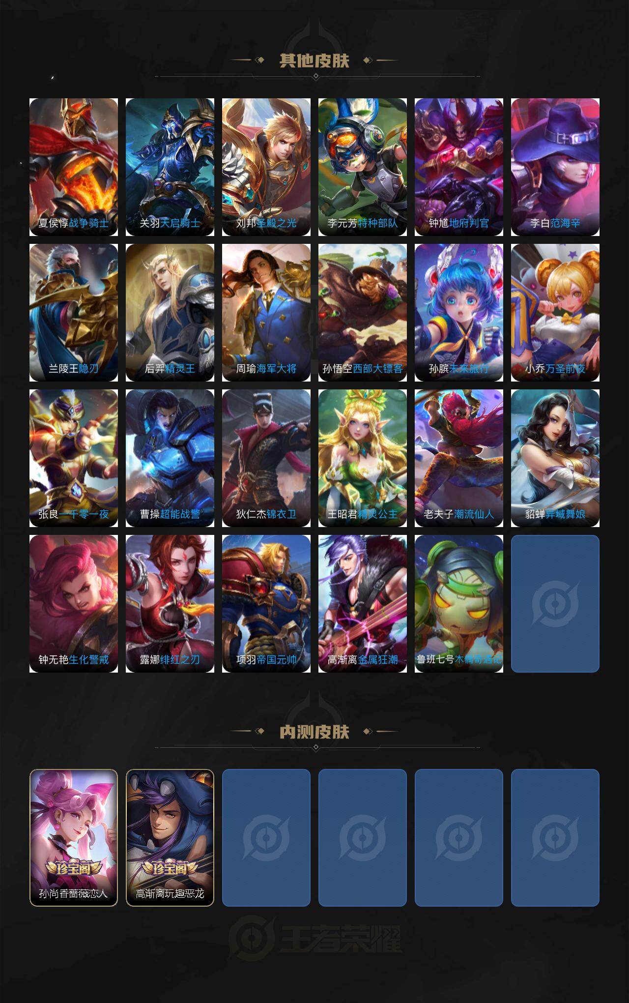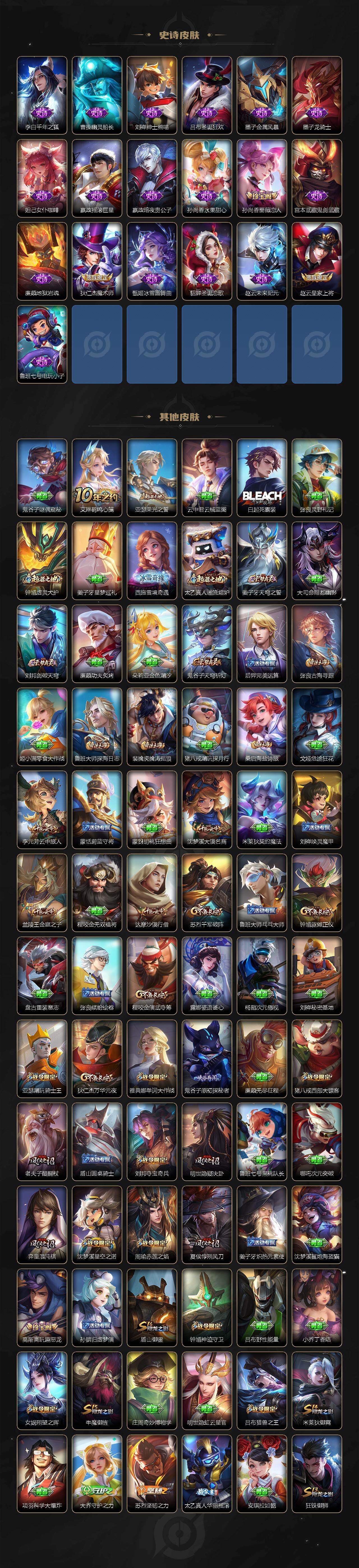 【限定皮肤】:白起狰,姜子牙天穹之誓,狄仁杰阴阳师,虞姬凯尔特女王,赵云皇家上将,嬴政白昼王子,孙尚香蔷薇恋人,鲁班七号狮舞东方,高渐离死亡摇滚,高渐离玩趣恶龙,阿轲迷踪丽影,扁鹊炼金王,芈月重明,吕布猎兽之王,周瑜赤莲之焰,元歌云间偶戏,元歌无心,夏侯惇朔风刀,甄姬游园惊梦,曹操烛龙,典韦穷奇,典韦蓝屏警告,马可波罗暗影游猎,狄仁杰魔术师,狄仁杰万华元夜,达摩沙漠行僧,项羽海滩派对,老夫子醍醐杖,程咬金演武夺筹,刘邦夺宝奇兵,兰陵王驯魔猎人,兰陵王金庭之子,亚瑟潮玩骑士王,孙悟空至尊宝,牛魔御旌,李元芳银河之约,李元芳云中旅人,钟馗神迹守卫,钟馗驱傩正仪,杨玉环遇见飞天,女娲朔望之晖,干将莫邪冰霜恋舞曲,雅典娜单词大作战,雅典娜黎明之约,蔡文姬繁星吟游,太乙真人饕餮,太乙真人华丽摇滚,鬼谷子原初探秘者,鬼谷子五谷丰年,苏烈千军破阵,百里玄策原初追逐者,弈星混沌棋,梦奇顽趣,沈梦溪星空之诺,沈梦溪大漠名商,明世隐疑决卦,裴擒虎李小龙,裴擒虎擒涛扼浪,狂铁御狮,米莱狄御霄,云中君纤云弄巧,盾山御銮,猪八戒西部大镖客,上官婉儿梁祝,上官婉儿天狼绘梦者,曜李逍遥 ,蒙犽狂想玩偶喵,鲁班大师探海日志,桑启海盐诗旅,张良古海寻踪,蒙恬荣光圣徽,鬼谷子天穹祈灯,刘邦剑破天穹