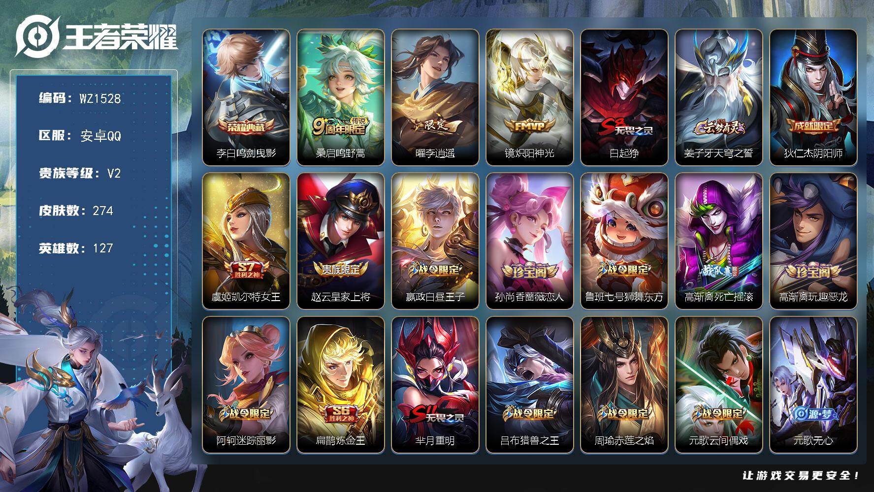 [17415999]安卓Q-V2-最强王者段位-127英雄-274皮肤-1典藏皮肤-3传说-66史诗