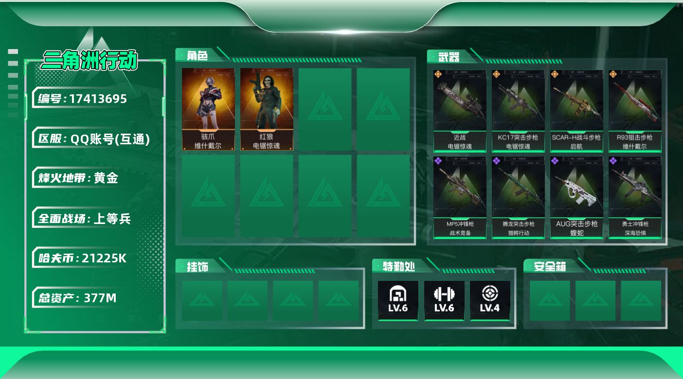 [17413695]总资产377m【店主推荐捡漏号!可直接换绑】21225k哈伏币-377m流动资产-60烽火等级-黄金-14战场等级-上等兵 【干员外观】:骇爪-维什戴尔,红狼-电锯惊魂 【近战皮肤】:近战-电锯惊魂,近战-黑鹰 【传说级普通外观】:SCAR-H战斗步枪-启航,KC17突击步枪-电锯惊魂,R93狙击步枪-维什戴尔 【史诗级普通外观】:AUG突击步枪-蝮蛇,腾龙突击步枪-猎鳄行动,MP5冲锋枪-战术竞备,勇士冲锋枪-深海恐惧 【稀有级普通外观】:AUG突击步枪-前沿科技,SCAR-H战斗步枪-荣耀列队,MP5冲锋枪-弄臣,Vector冲锋枪-先锋,SMG-45-行动开启,M1014霰弹枪-幻影结构,Mini-14射手步枪-荣耀列队,SV-98狙击步枪-星链科技,G18-星链科技 【普通级普通外观】:M4A1突击步枪-高雅黑,M4A1突击步枪-海色,QBZ95-1突击步枪-高雅黑,QBZ95-1突击步枪-海浪,QBZ95-1突击步枪-三角洲力量,QBZ95-1突击步枪-海色,K416突击步枪-几何迷彩,M7战斗步枪-红色涂装,SG552突击步枪-三角洲力量,SG552突击步枪-浅蓝涂装,SCAR-H战斗步枪-数码迷彩,G3战斗步枪-高雅黑,PTR-32突击步枪-黄蜂,MP5冲锋枪-海色,MP5冲锋枪-黄蜂,UZI冲锋枪-海色,QCQ171冲锋枪-三角洲力量,M1014霰弹枪-高雅黑,M1014霰弹枪-海浪,M249轻机枪-黄蜂,SR-25射手步枪-黄蜂,SV-98狙击步枪-红色涂装,沙漠之鹰-海浪 【军牌】:军牌-装备修理,军牌-永恒,军牌-零号大坝,军牌-来点薯条,军牌-幸福国,军牌-信誉优秀 【挂饰】:挂饰-维什戴尔,挂饰-诡影狙击兵,挂饰-诡影喷火兵,挂饰-启程,挂饰-阿萨拉徽章