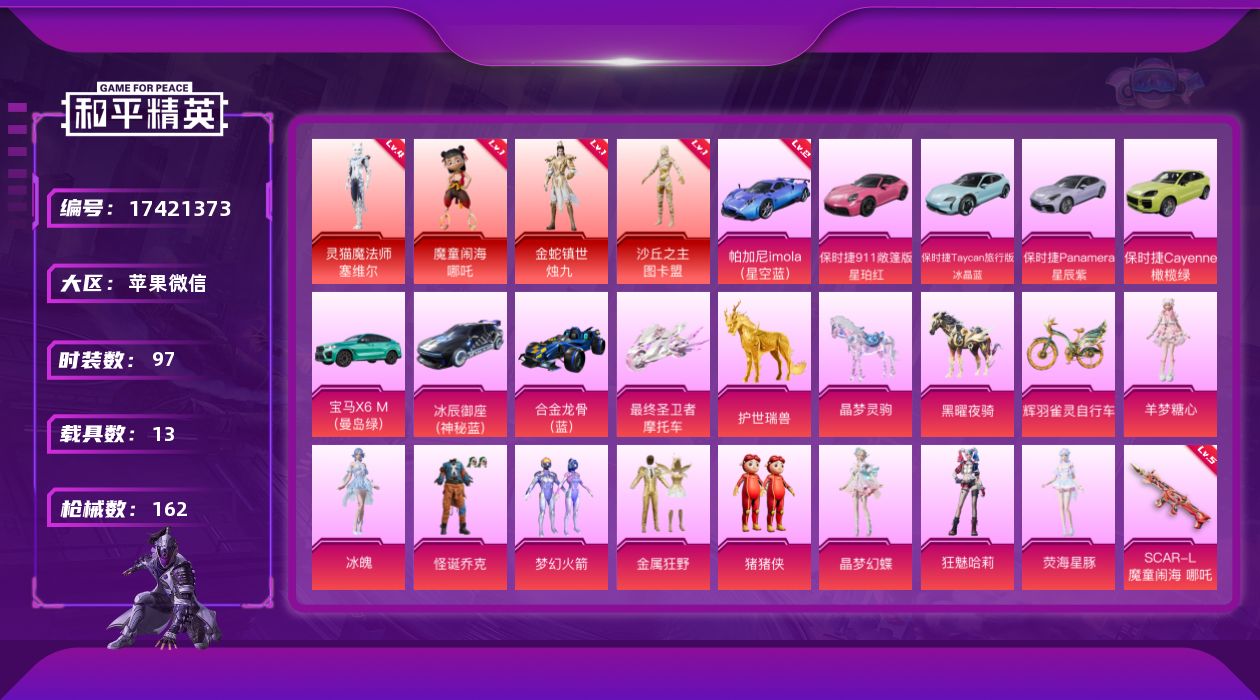 [17421373]苹果 微信-4神装-11粉装-10特效枪-13载具-16粉色飞行器-78205热力值-7王牌印记-97套装-162枪皮【红色载具】:帕加尼imola(星空蓝)(二级)【红色神装等级】:魔童闹海-哪吒(一级),灵猫魔法师-塞维尔(四级),金蛇镇世-烛九(一级),沙丘之主-图卡盟(一级)【红色角色神装】:魔童闹海-哪吒,灵猫魔法师-塞维尔,金蛇镇世-烛九,沙丘之主-图卡盟【热门品类】:粉装-怪诞乔克,粉装-梦幻火箭,角色-军刀雅典娜,套装-忍者信条,套装-红熊茄茄【粉色套装】:粉装-怪诞乔克,粉装-梦幻火箭,粉装-金属狂野,玩偶服-猪猪侠,角色-晶梦幻蝶,角色-狂魅哈莉,角色-荧海星豚,角色-冰魄,角色-羊梦糖心【粉色枪皮等级】:SCAR-L-金蛇镇世(一级),SCAR-L-魔童闹海 哪吒(五级),GROZA-镜光银凌(五级),Vector-环太平洋(二级),Vector-最终圣卫者(一级),P90-沙丘之主(三级),Kar98K-巳巳如意(五级),DP-28-豹影疾电(五级),MG3-辉羽雀灵(三级),燃烧瓶-薄荷可可(五级)【粉色载具】:帕加尼imola(星空蓝),宝马X6 M(曼岛绿),冰辰御座(神秘蓝),保时捷911 敞篷版(星珀红),保时捷Taycan 旅行版(冰晶蓝),保时捷Panamera(星辰紫),保时捷Cayenne(橄榄绿),合金龙骨(蓝),最终圣卫者摩托车,僚机-圣域龙宝,护世瑞兽,晶梦灵驹,黑曜夜骑,辉羽雀灵自行车【粉色枪皮】:SCAR-L-金蛇镇世,SCAR-L-魔童闹海 哪吒,GROZA-镜光银凌,Vector-环太平洋,Vector-最终圣卫者,P90-沙丘之主,Kar98K-巳巳如意,DP-28-豹影疾电,MG3-辉羽雀灵,燃烧瓶-薄荷可可【粉色飞行器】:酣梦熊熊飞行器,炫彩糖果飞行器,祥瑞起舞飞行器,梦幻火箭飞行器,镜光幻境飞行翼,沙丘之主天马,镜域双华-灵镜之阶,龙翔九天飞行器,时空协奏飞行器,万象金身飞行器,圣域金龙飞行器,雀灵庇佑飞行器,终晖之翼飞行器,灵猫魔法师飞行器,飞天猪飞行器,灵珠游龙飞行器