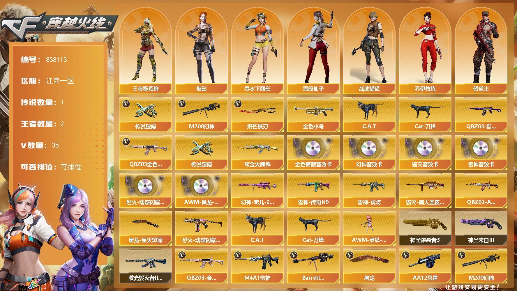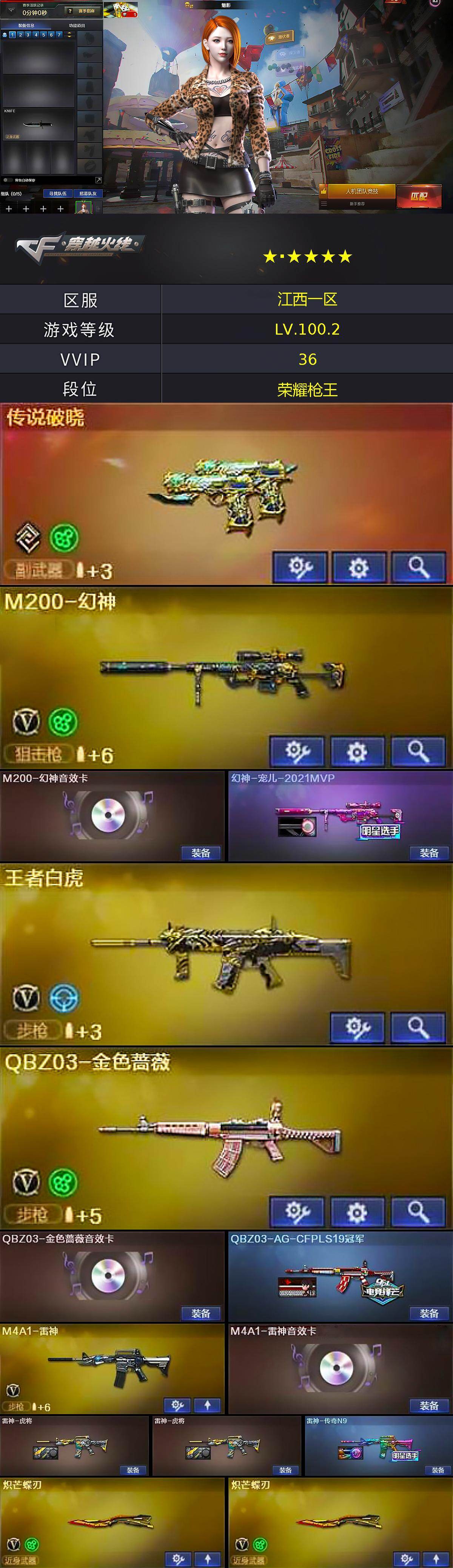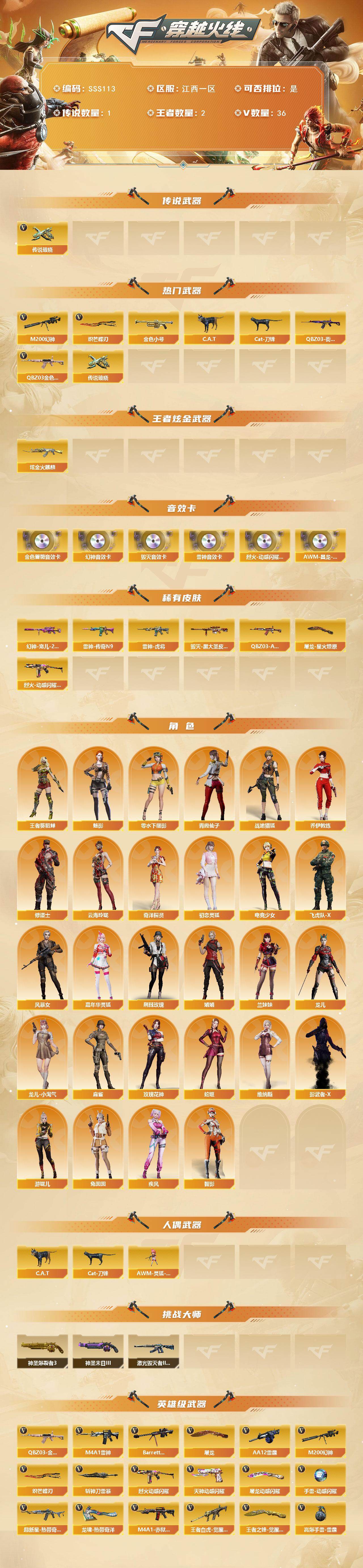 [17423463]江西一区-36V-2王者武器数-1炫金武器数 【传说武器】:传说破晓 【热门武器】:传说破晓,QBZ03-金色蔷薇,M200-幻神,QBZ03-街机,金色小号,C.A.T,Cat-刀锋,炽芒蝶刃*2 【王者炫金武器】:炫金火麒麟 【音效卡】:烈火-动感闪耀 音效卡,M200-幻神音效卡,M4A1-雷神音效卡,Barrett-毁灭音效卡,QBZ03-金色蔷薇音效卡,AWM-昌龙-怀旧音效卡*2 【皮肤】:幻神-宠儿-2021MVP,QBZ03-AG-CFPLS19冠军,雷神-虎将*2,雷神-传奇N9,毁灭-黑大圣皮肤,烈火-动感闪耀 皮肤,屠龙-星火燎原 【角色】:魅影,战地猎狐,王者-葵-貂蝉,奇洋探员,乔伊教练,修道士,云海玲珑,初恋灵狐,电竞少女,飞虎队-X,风暴女,嘉年华灵狐,疾风,荆棘玫瑰,娟娟,兰妹妹,零-水下丽影,龙儿,龙儿-小淘气,麻雀,玫瑰花神,青霞仙子,蛇姬,兔囡囡,维纳斯,影武者-X,游珑儿,智影 【人偶武器】:AWM-灵狐-15周年嘉年华,C.A.T,Cat-刀锋 【挑战大师】:神圣爆裂者III,激光毁灭者III-白马银枪,神圣爆裂者-末日III 【英雄级武器】:M4A1-雷神,超新星-热带奇洋,QBZ03-金色蔷薇,烈火-动感闪耀,王者白虎-觉醒版,Barrett-毁灭,M200-幻神,AA-12-雷霆,天神-动感闪耀,屠龙,炽芒蝶刃*2,屠龙-动感闪耀,龙啸-热带奇洋,斩神刀-雷暴,王者之锋-觉醒版,高爆手雷-雷霆,高爆手雷-雷暴,高爆手雷-幻灵,手雷-动感闪耀,手雷-热带奇洋,闪光弹-雷霆,闪光弹-雷暴,闪光弹-幻灵*2,烟雾弹-雷霆,烟雾弹-雷暴,烟雾弹-幻灵,M4A1-赤狱骑士 【道具】:云海游龙炫彩背包,亚洲杯纪念炫彩背包,奇洋探员-海龟背包,战舰背包,沙漠龙背包-猛男专属,炫彩背包-诺拉,炫彩背包,热带奇洋炫彩背包,臻选金狐背包,女皇终结者-魔龙之吻,救世主-黑桃战神,绿色巨人,灵魂忍者,迷雾幽灵,夺命之镰,防化服*3,金色流光-枪王排位*2,星辰流光-枪王排位,流光-鎏金之域,流光-再燃火线,枪王排位28赛季金色流光,枪王排位29赛季金色流光,语音特效-热带奇洋,热带奇洋表情,动感闪耀表情,C4-再燃火线,防弹头盔*3,防弹衣*4,C4工具钳*3,手雷包*3 【特殊枪械】: