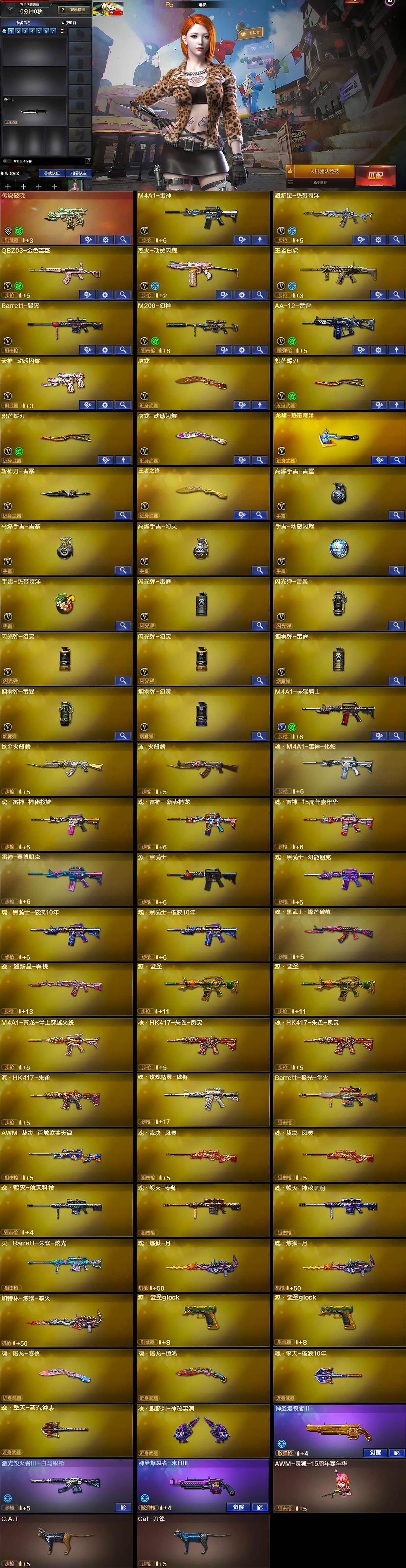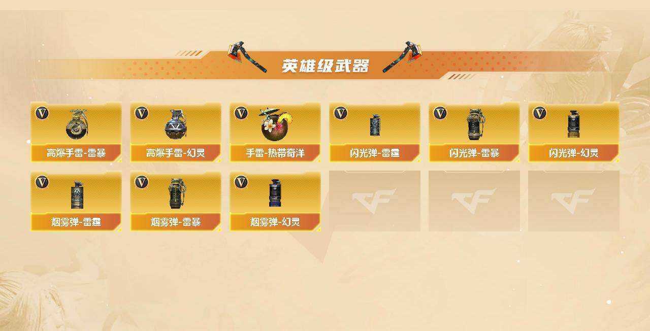 【英雄级武器】:M4A1-雷神,超新星-热带奇洋,QBZ03-金色蔷薇,烈火-动感闪耀,王者白虎-觉醒版,Barrett-毁灭,M200-幻神,AA-12-雷霆,天神-动感闪耀,屠龙,炽芒蝶刃*2,屠龙-动感闪耀,龙啸-热带奇洋,斩神刀-雷暴,王者之锋-觉醒版,高爆手雷-雷霆,高爆手雷-雷暴,高爆手雷-幻灵,手雷-动感闪耀,手雷-热带奇洋,闪光弹-雷霆,闪光弹-雷暴,闪光弹-幻灵*2,烟雾弹-雷霆,烟雾弹-雷暴,烟雾弹-幻灵,M4A1-赤狱骑士