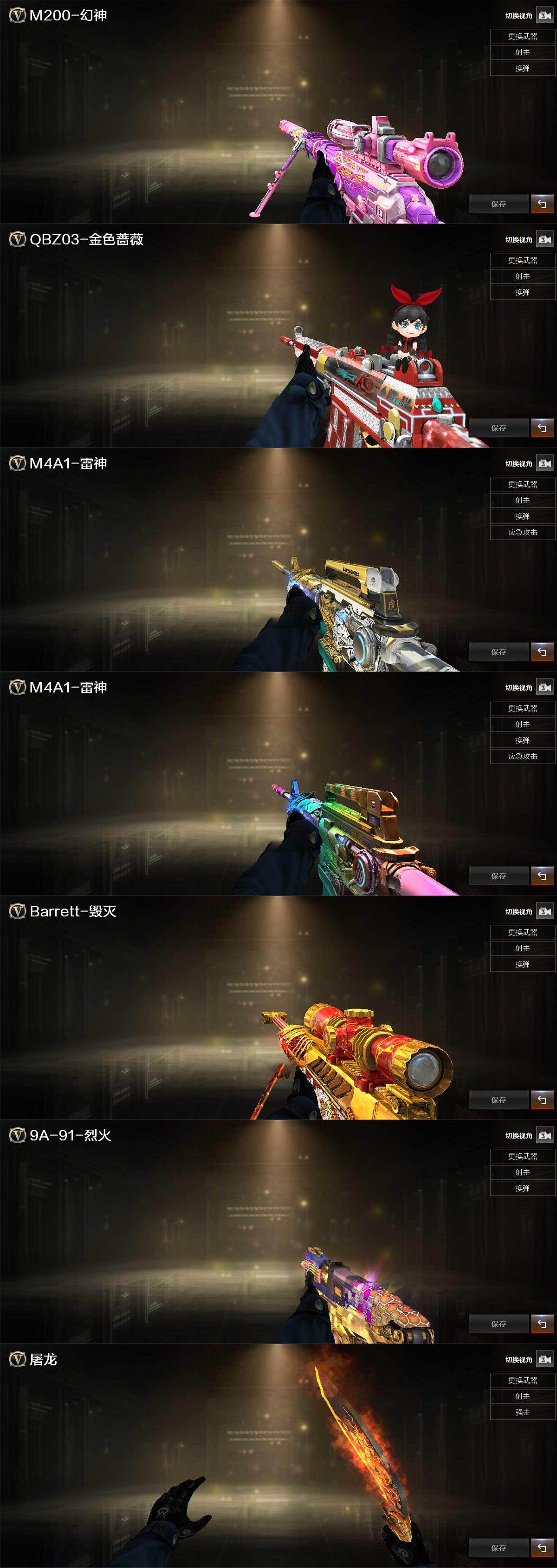 【音效卡】:烈火-动感闪耀 音效卡,M200-幻神音效卡,M4A1-雷神音效卡,Barrett-毁灭音效卡,QBZ03-金色蔷薇音效卡,AWM-昌龙-怀旧音效卡*2
