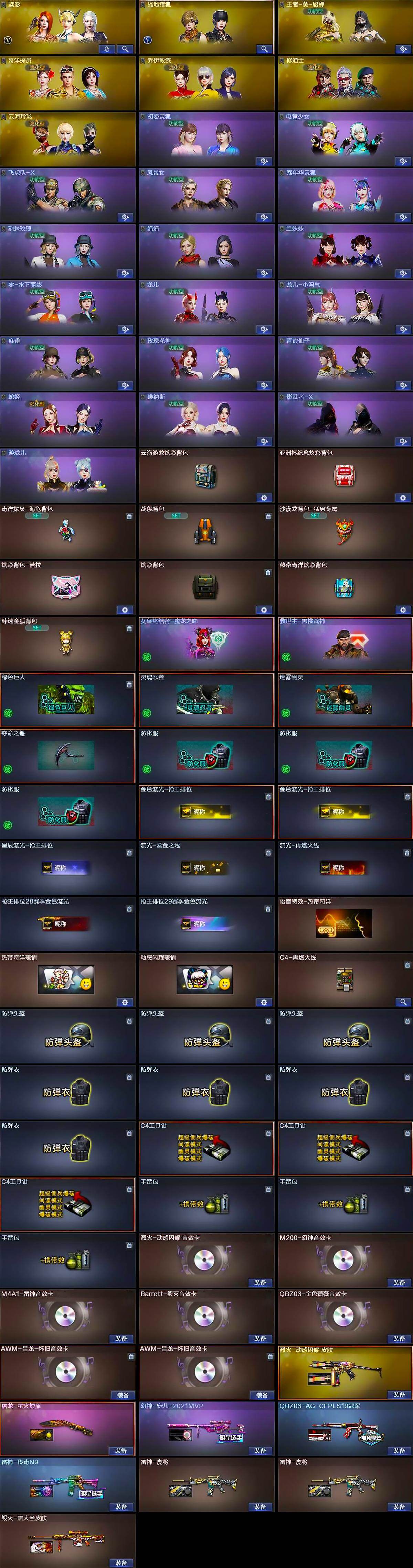 【道具】:云海游龙炫彩背包,亚洲杯纪念炫彩背包,奇洋探员-海龟背包,战舰背包,沙漠龙背包-猛男专属,炫彩背包-诺拉,炫彩背包,热带奇洋炫彩背包,臻选金狐背包,女皇终结者-魔龙之吻,救世主-黑桃战神,绿色巨人,灵魂忍者,迷雾幽灵,夺命之镰,防化服*3,金色流光-枪王排位*2,星辰流光-枪王排位,流光-鎏金之域,流光-再燃火线,枪王排位28赛季金色流光,枪王排位29赛季金色流光,语音特效-热带奇洋,热带奇洋表情,动感闪耀表情,C4-再燃火线,防弹头盔*3,防弹衣*4,C4工具钳*3,手雷包*3